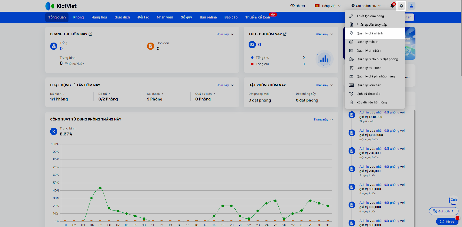 Tính năng Quản lý chi nhánh giúp các chủ khách sạn sở hữu chuỗi cơ sở kinh doanh dễ dàng kiểm soát hoạt động của từng điểm bán trên cùng một tài khoản quản trị duy nhất. Việc phân chia chi nhánh giúp tách biệt báo cáo doanh thu, quản lý kho và nhân viên, đồng thời hỗ trợ luân chuyển hàng hóa giữa các kho một cách linh hoạt.