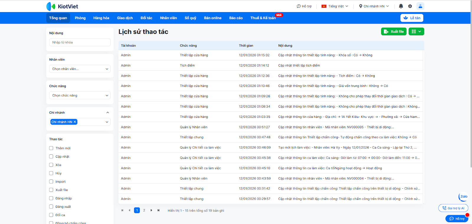 - Bảo mật dữ liệu: Sử dụng tính năng Khóa sổ để ngăn chặn việc sửa đổi dữ liệu quá khứ và Lịch sử thao tác để giám sát nhân viên.