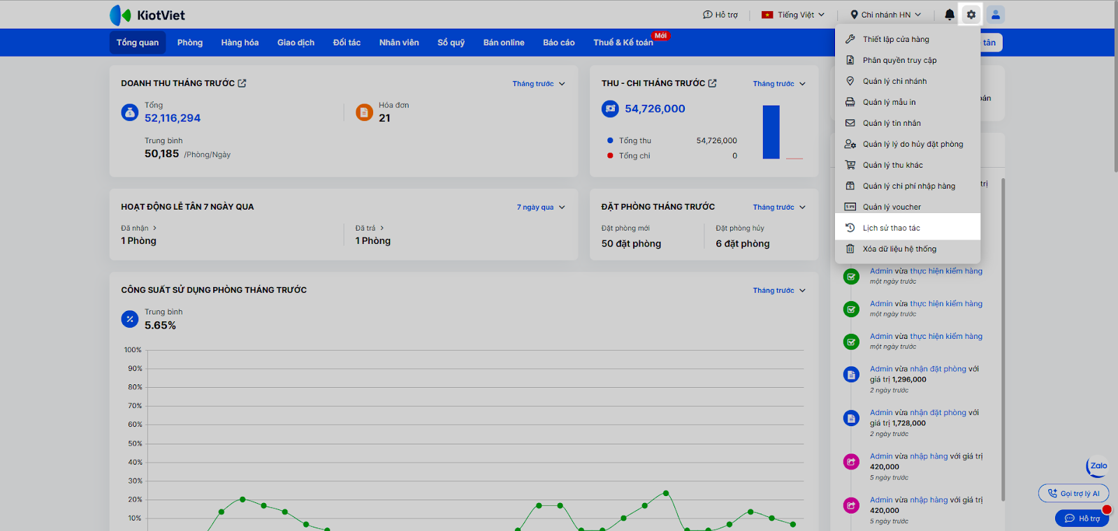- Tại màn hình Quản lý, nhấn Thiết lập → chọn Lịch sử thao tác.