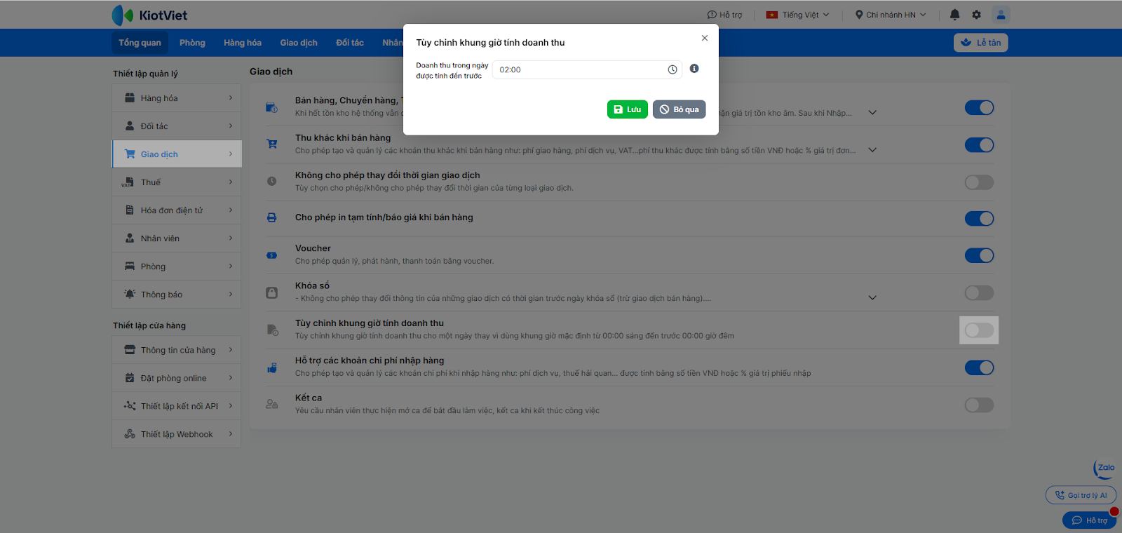 - Tùy chỉnh khung giờ tính doanh thu: Trong khối Thiết lập quản lý → Giao dịch → bật tính năng → cài đặt ngày làm việc của khách sạn (Ví dụ: Từ 02:00 sáng hôm nay đến 01:59 sáng hôm sau) giúp báo cáo doanh thu chính xác hơn với mô hình kinh doanh đêm.