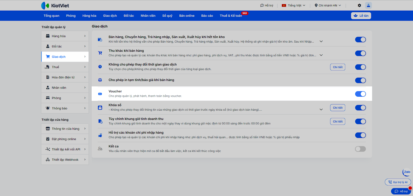 - Voucher: Trong khối Thiết lập quản lý → Giao dịch → bật tính năng để cho phép thanh toán bằng mã quà tặng.