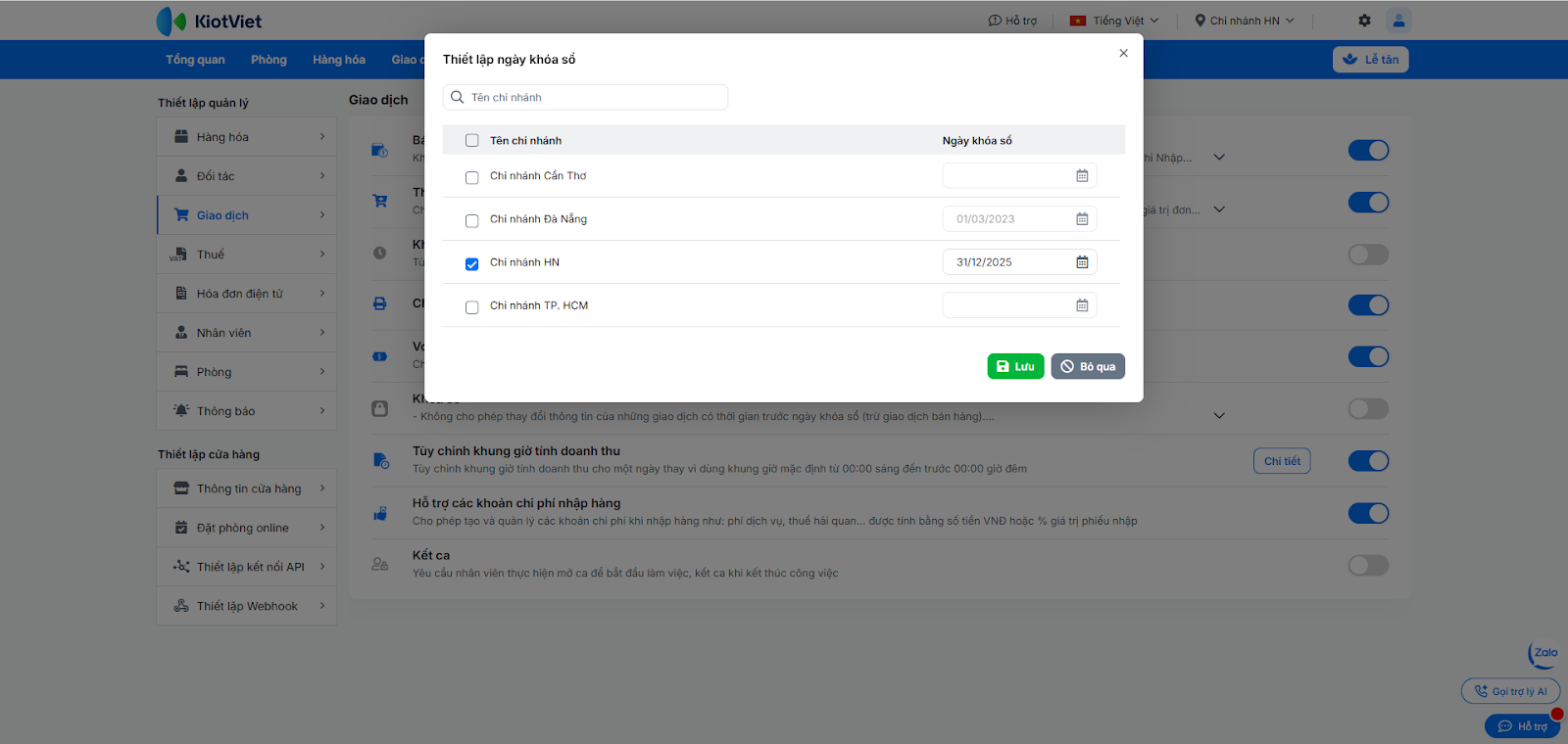 - Thiết lập ngày khóa sổ: Chọn chi nhánh và ngày muốn khóa (Ví dụ: 31/12/2025). Tích chọn “Áp dụng cho các chi nhánh đang chọn” nếu muốn khóa đồng loạt.