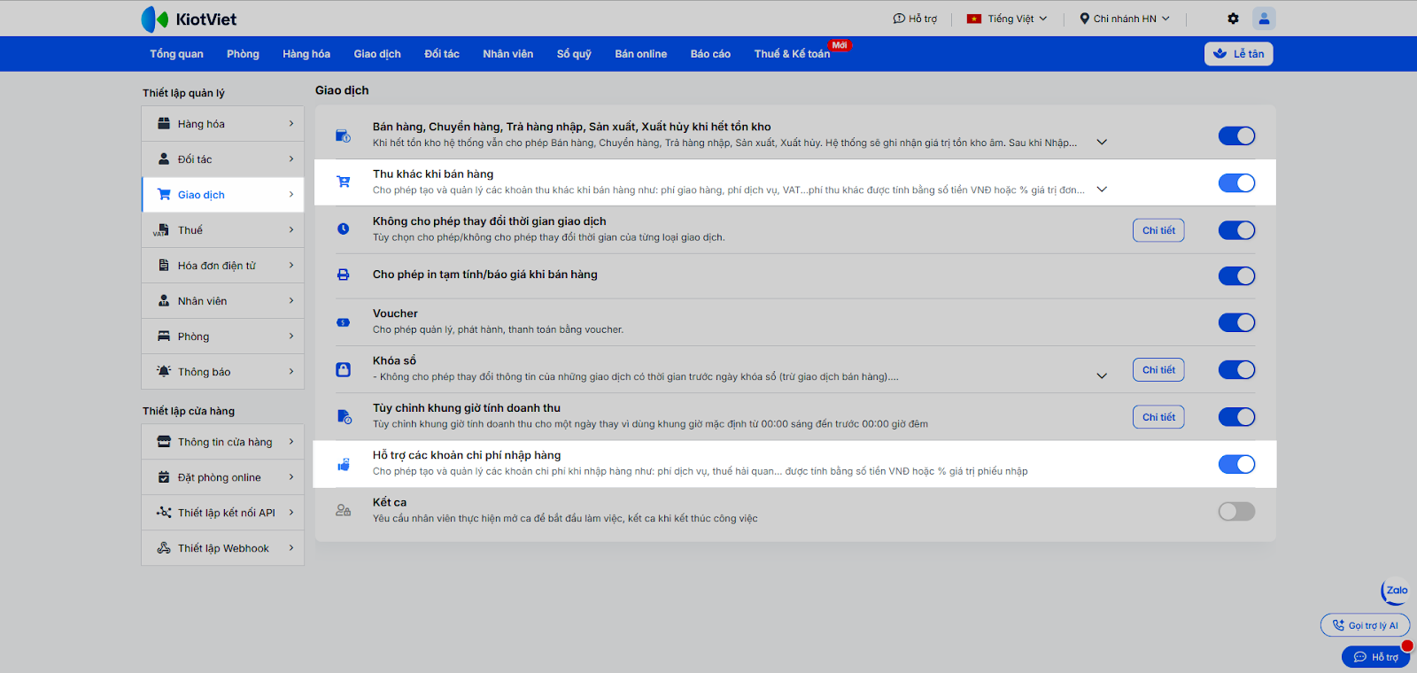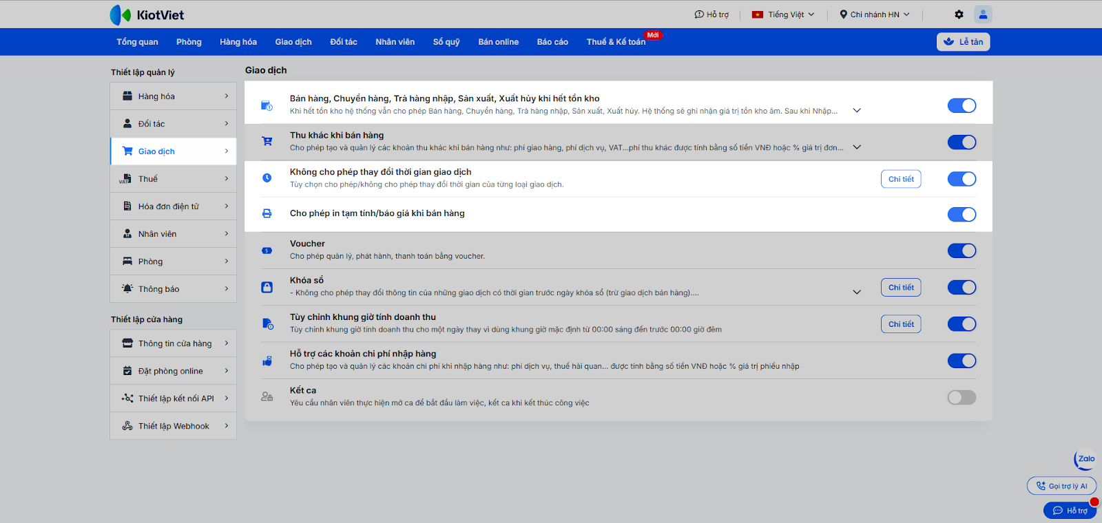 - Trong khối Thiết lập quản lý, chọn mục Giao dịch.