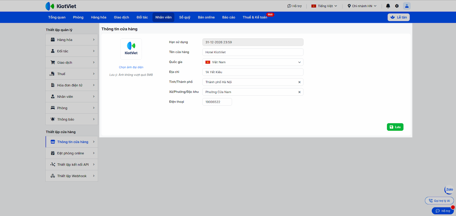 - Tình huống: Bạn muốn cập nhật Logo khách sạn, địa chỉ và số hotline để hiển thị chuyên nghiệp trên hóa đơn in ra cho khách.