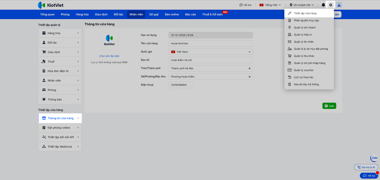 Tính năng Thiết lập cửa hàng là “trung tâm điều khiển” giúp chủ khách sạn cấu hình toàn bộ hệ thống vận hành. Tại đây, bạn có thể tùy chỉnh các quy tắc về tính giá vốn, quy định giờ nhận/trả phòng, quản lý điểm tích lũy và cập nhật thông tin nhận diện thương hiệu trên các mẫu in.