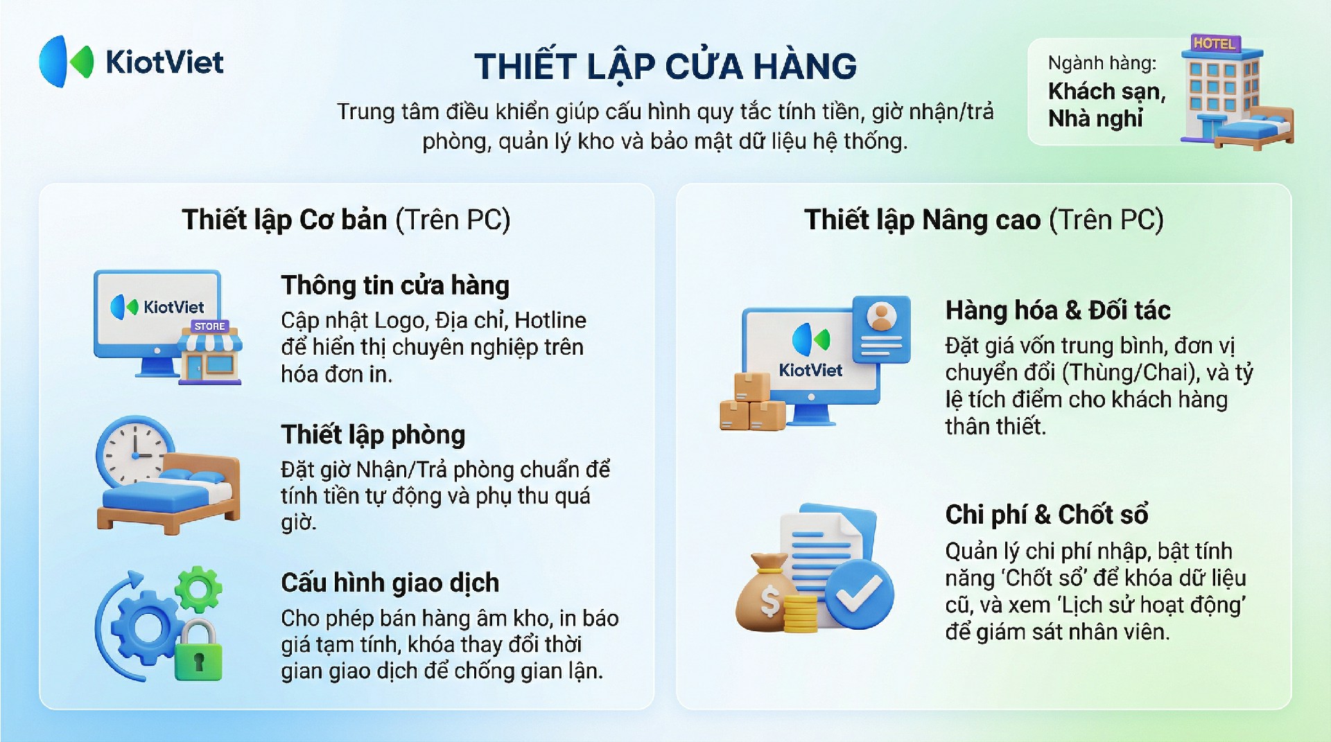 Dưới đây là các thiết lập nền tảng mà mọi khách sạn cần thực hiện khi bắt đầu sử dụng phần mềm.
