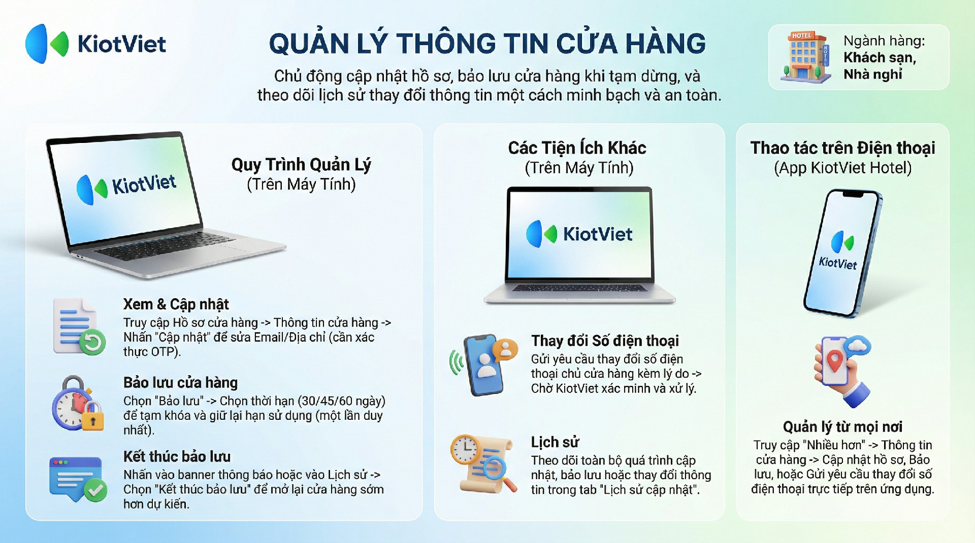 Tính năng này cho phép bạn chủ động xem và quản lý thông tin cá nhân/doanh nghiệp đã ký hợp đồng với KiotViet, bao gồm khả năng cập nhật thông tin hồ sơ, bảo lưu gian hàng khi tạm ngưng sử dụng, và theo dõi lịch sử các thay đổi.