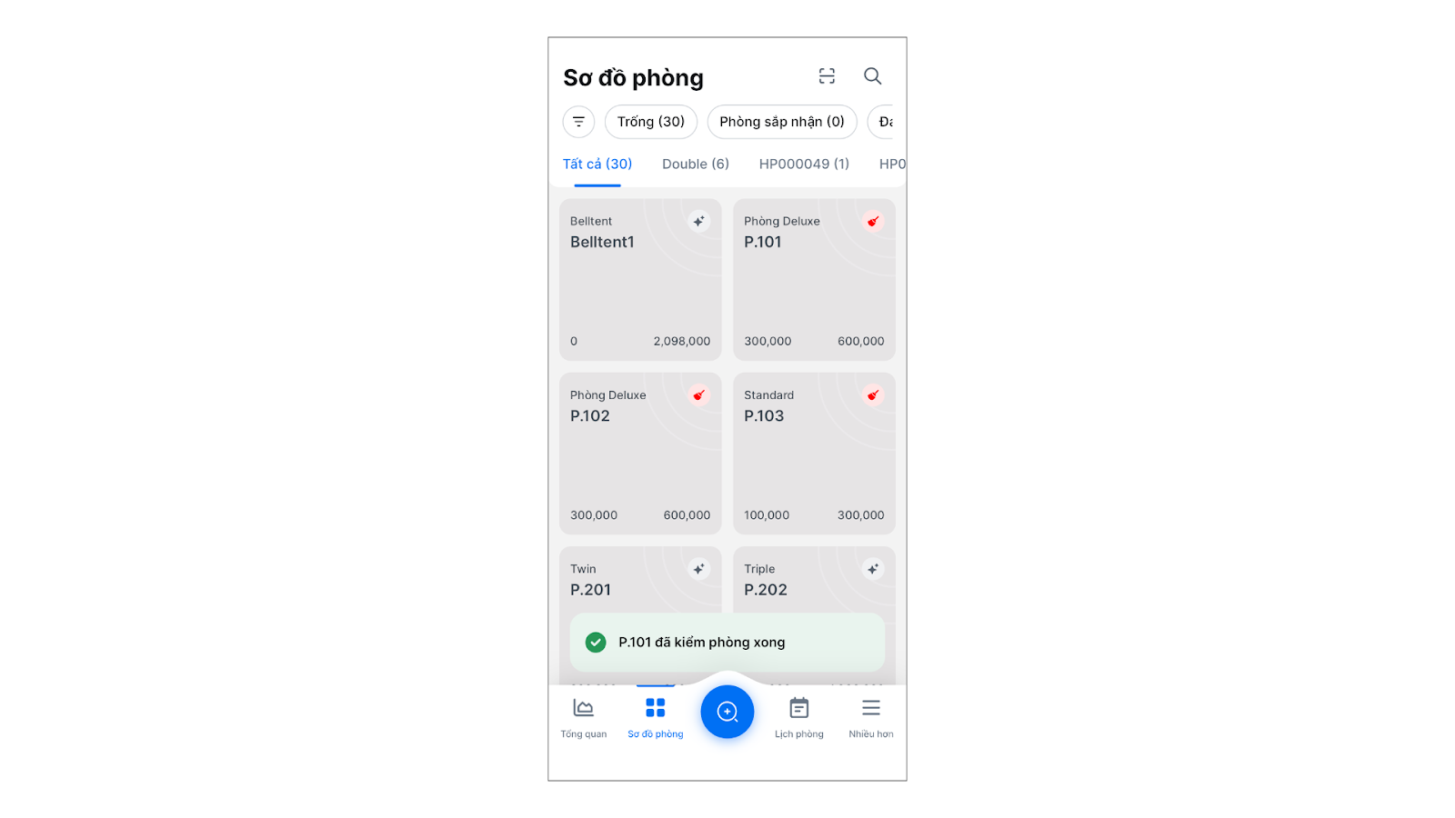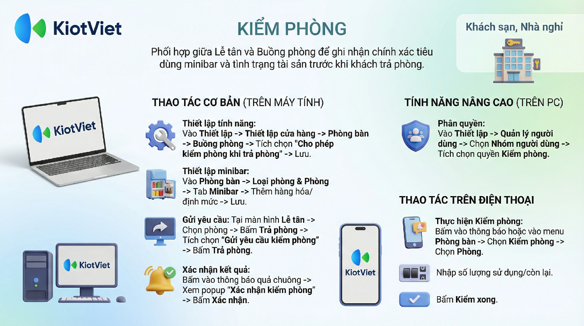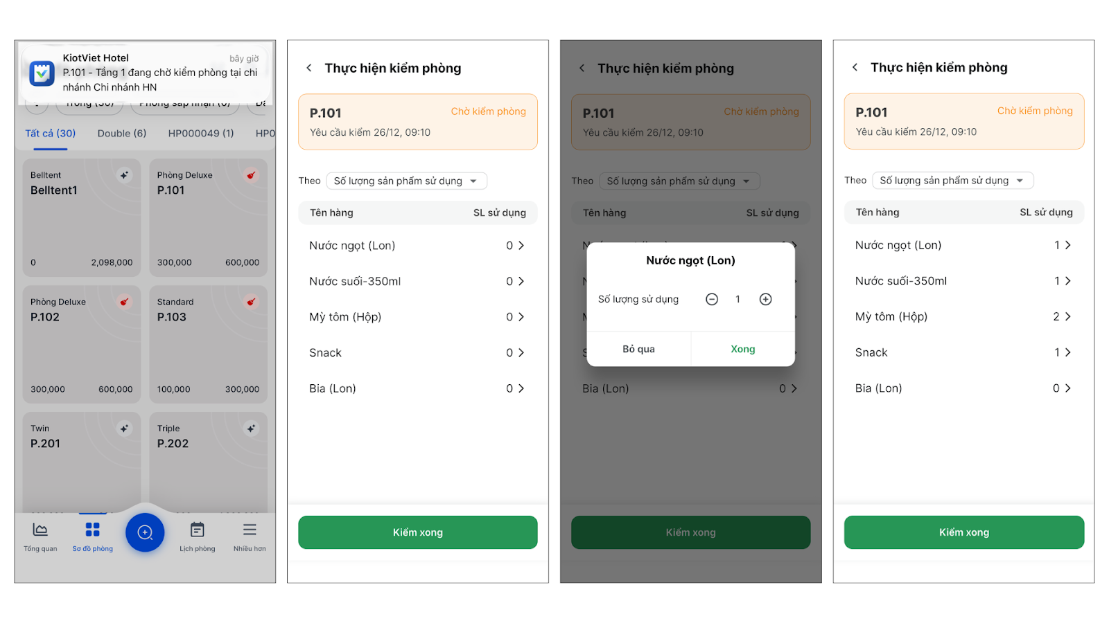 - Hạn chế sai sót: Kết quả kiểm phòng từ điện thoại được đồng bộ ngay lập tức về màn hình thanh toán của lễ tân.