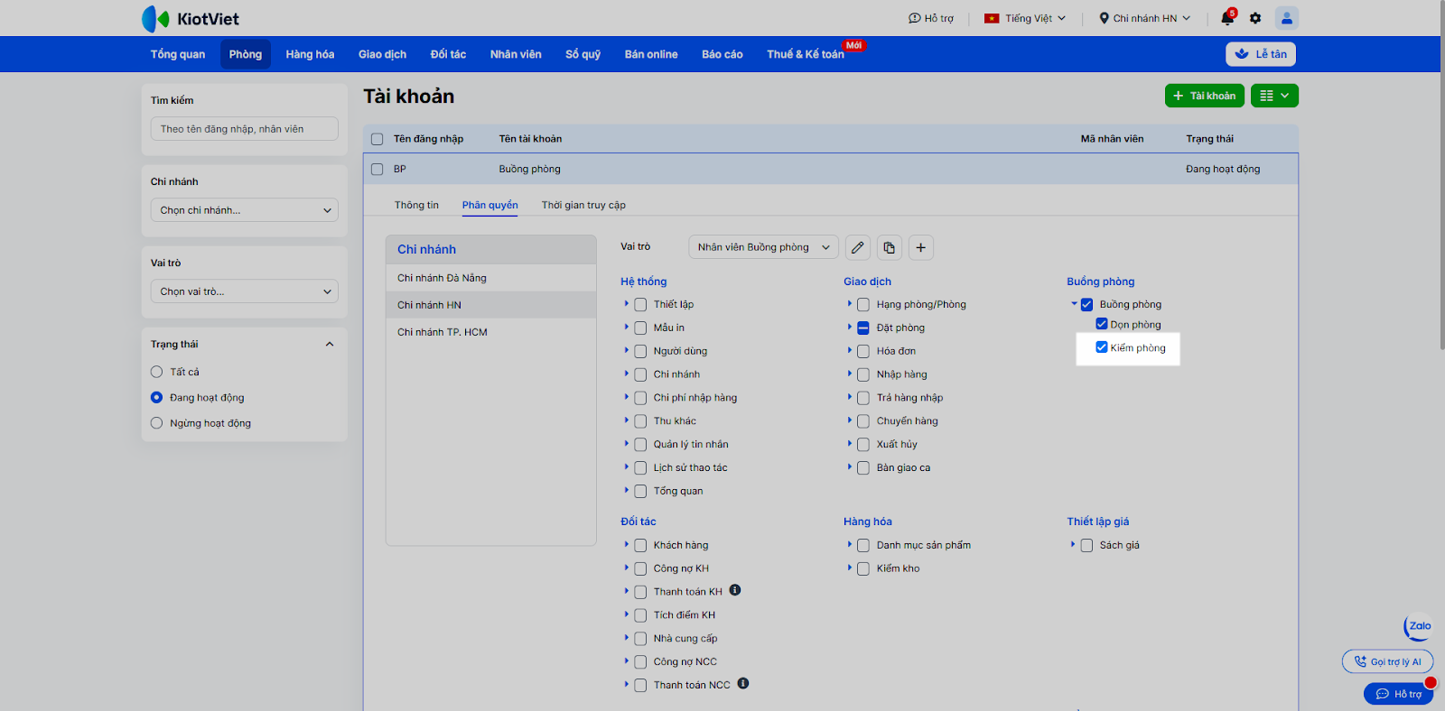 - Chọn nhóm người dùng (ví dụ: Nhân viên Buồng phòng) và tích chọn quyền Kiểm phòng trong mục Buồng phòng.