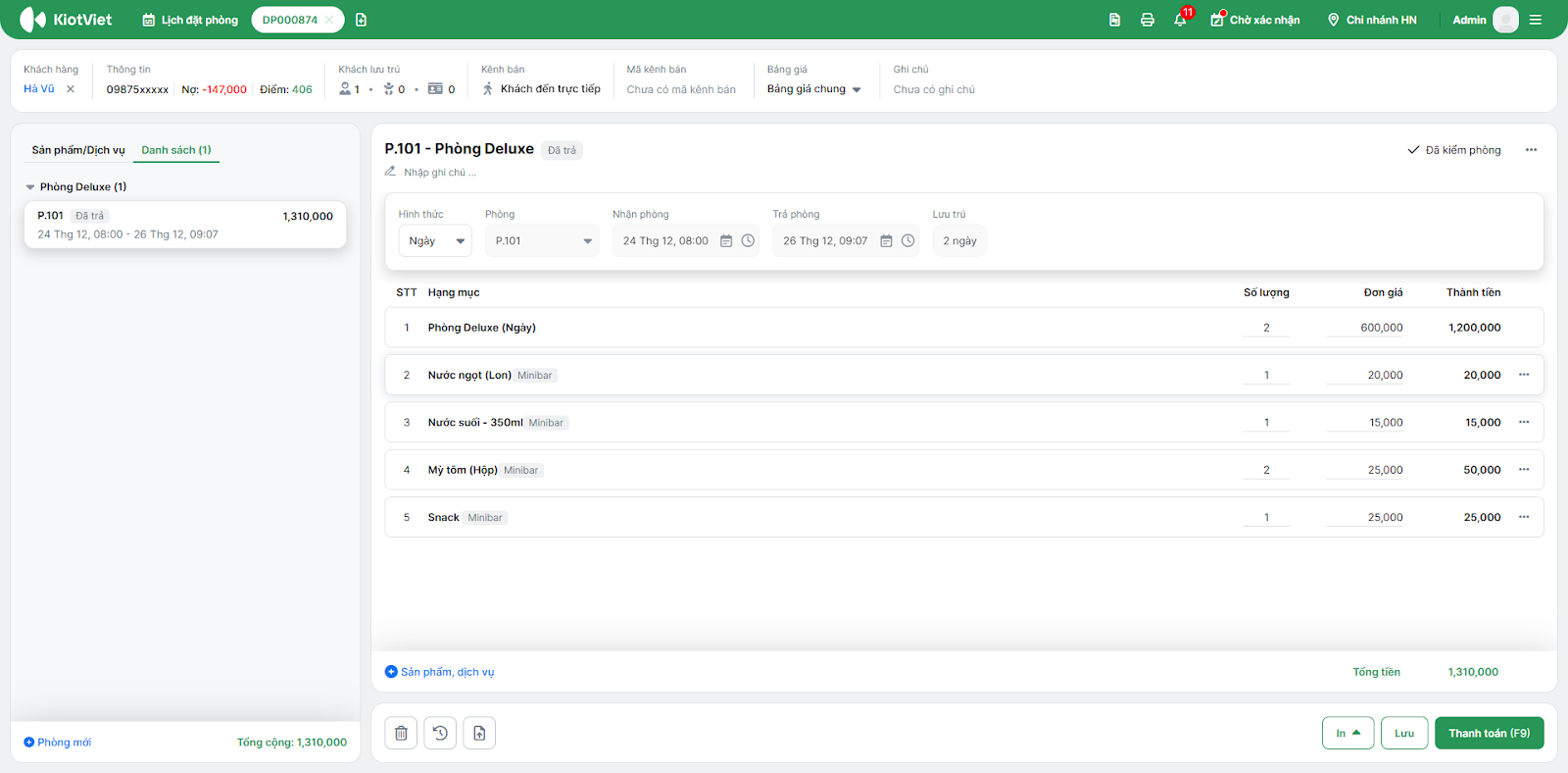 - Quản lý Minibar chặt chẽ: Tự động đối chiếu danh mục hàng hóa theo từng hạng phòng để ghi nhận số lượng tiêu dùng.