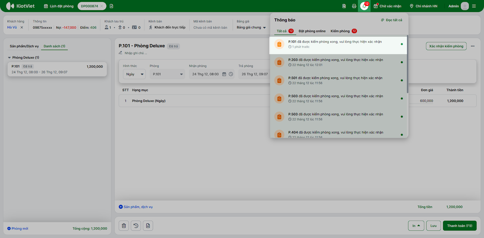 - Tình huống: Khách hàng báo trả phòng tại quầy, bạn cần gửi lệnh yêu cầu nhân viên buồng phòng lên kiểm tra thực tế.