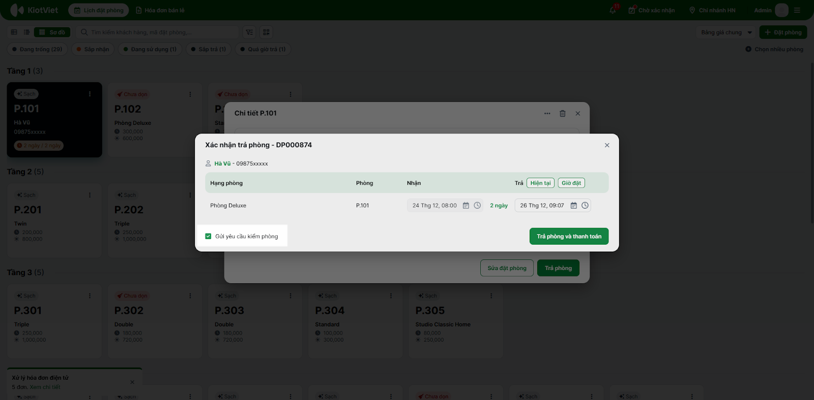 - Trên cửa sổ xác nhận, tích chọn ô Gửi yêu cầu kiểm phòng.
