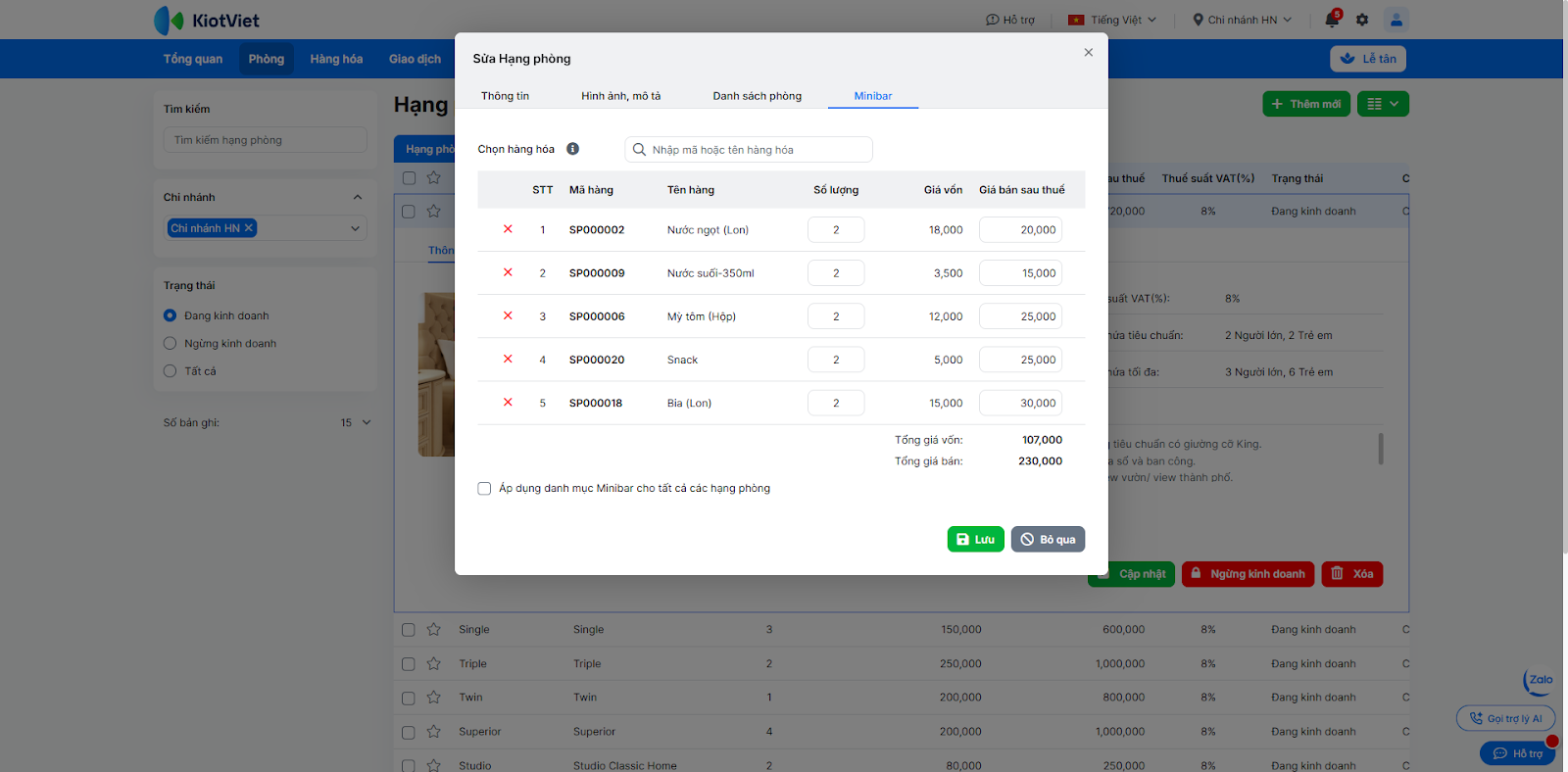 - Tùy chọn Áp dụng danh mục Minibar cho tất cả các hạng phòng.