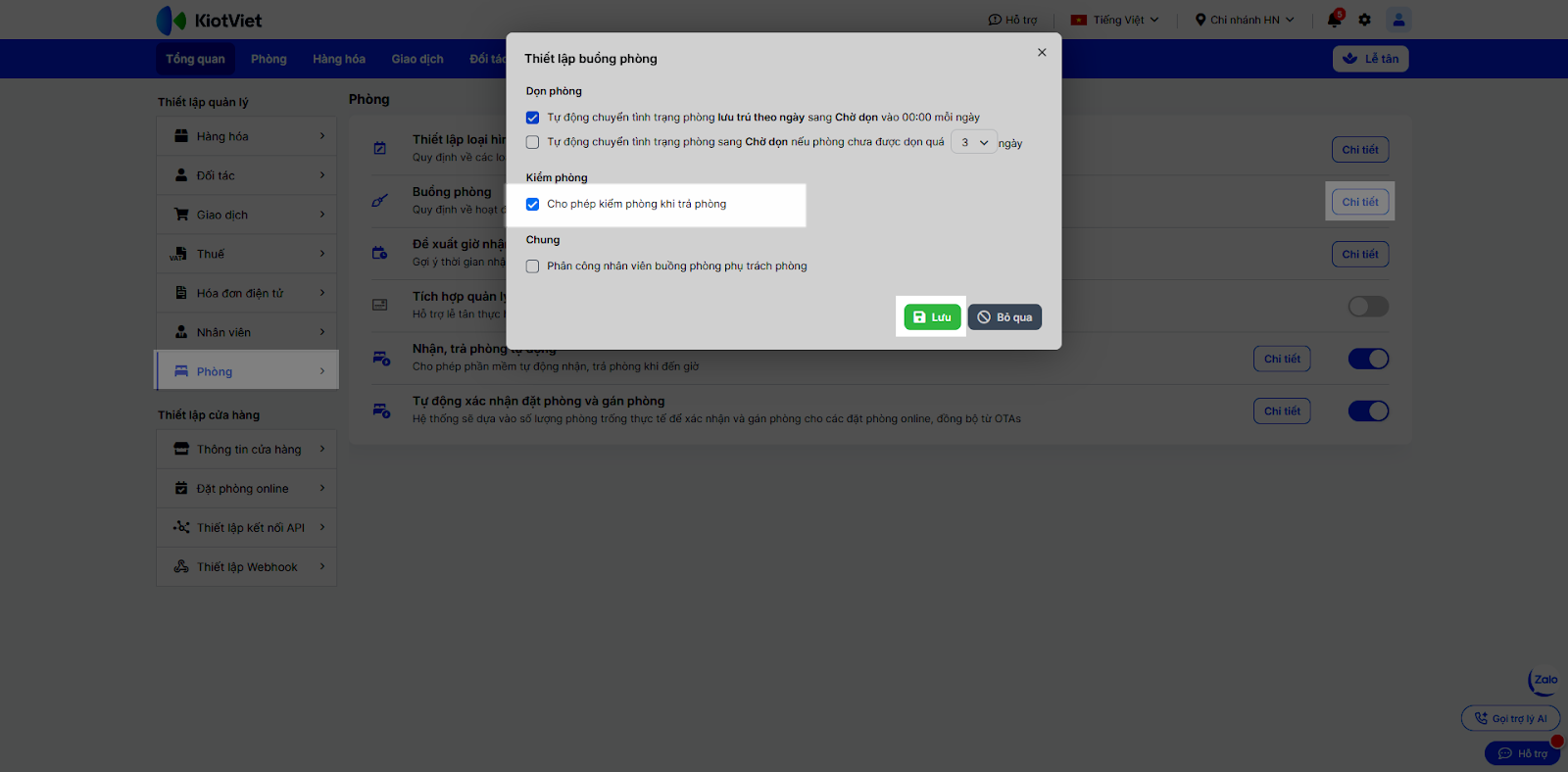 - Chọn Phòng → Buồng phòng → nhấn Chi tiết → tích chọn tính năng Cho phép kiểm phòng khi trả phòng → nhấn Lưu.
