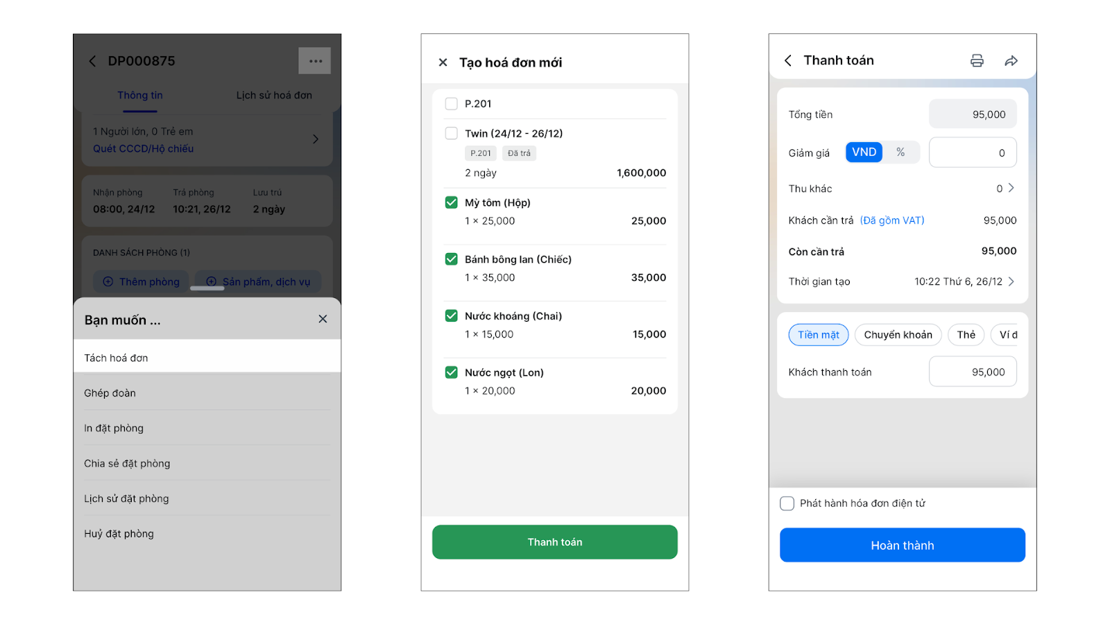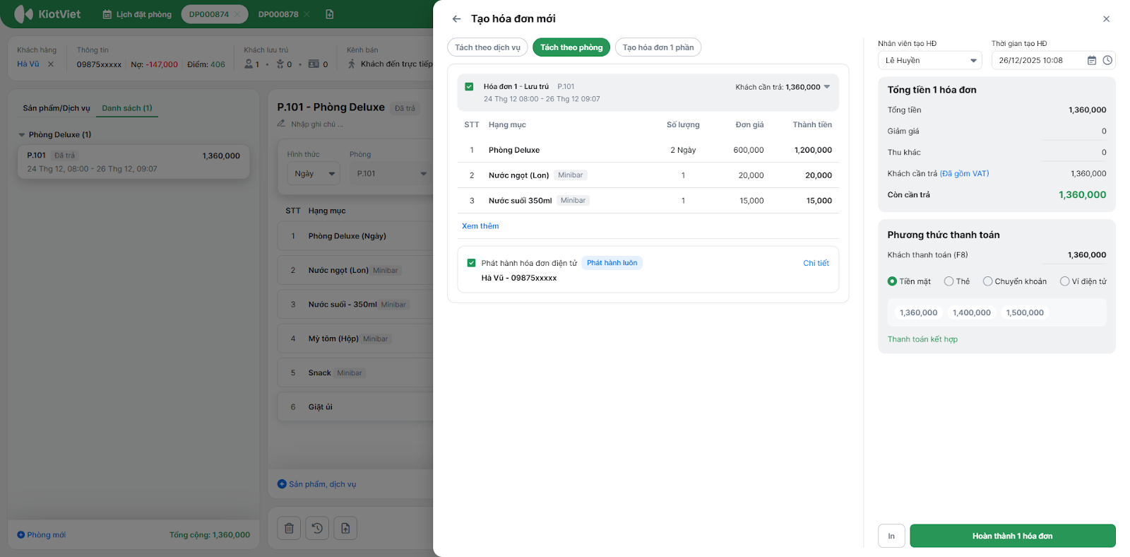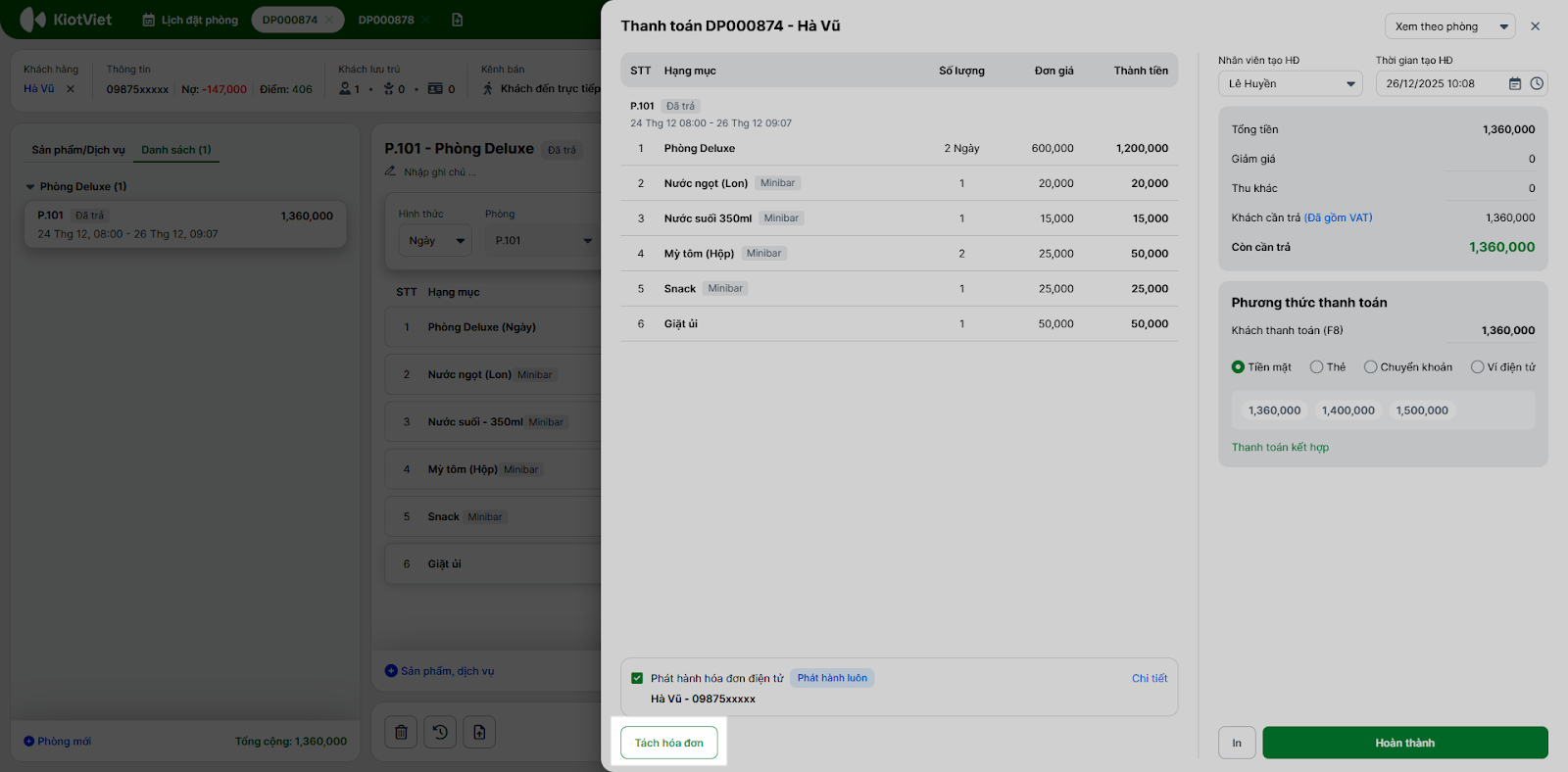 - Tách hóa đơn thông minh: Cho phép tách riêng tiền phòng, tiền dịch vụ hoặc phụ thu thành nhiều hóa đơn khác nhau theo yêu cầu của khách.