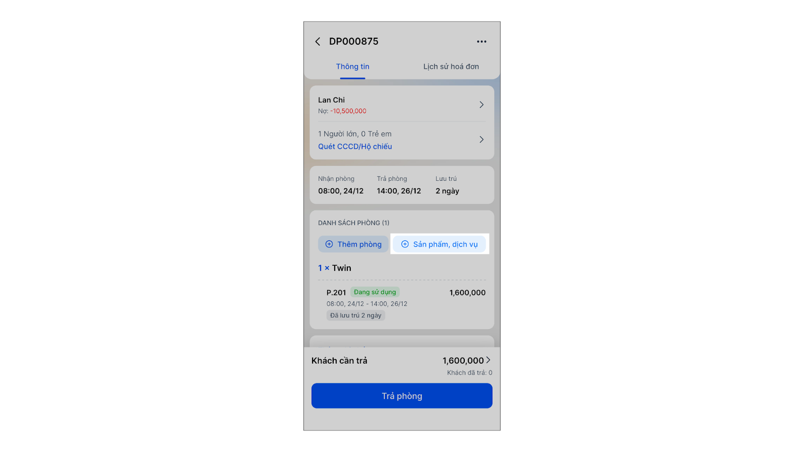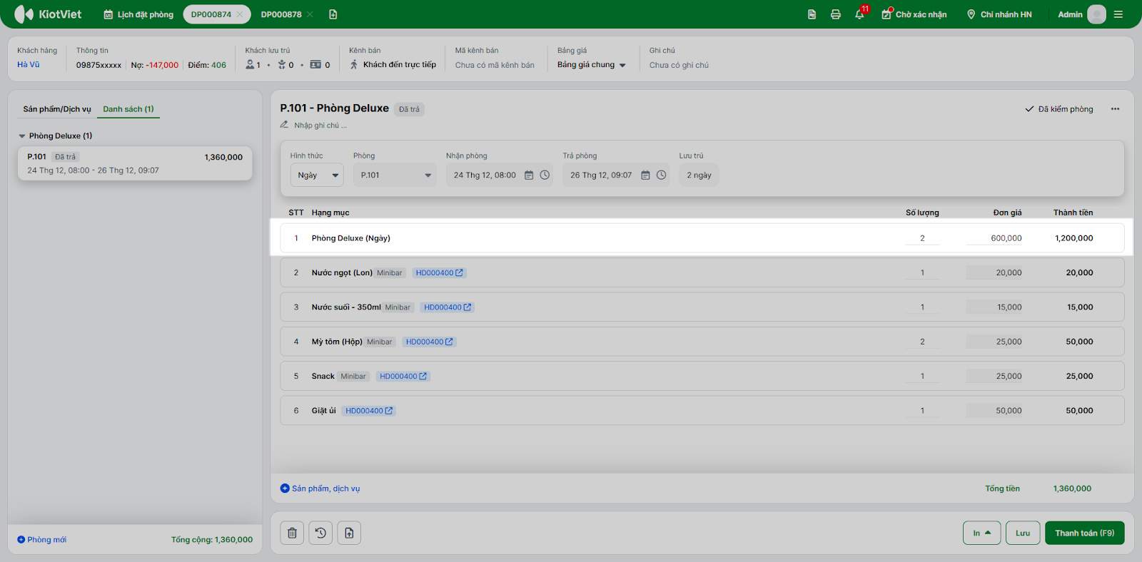 - Tình huống: Sau khi xác nhận giờ trả phòng, bạn cần kết xuất hóa đơn cuối cùng để khách thanh toán.