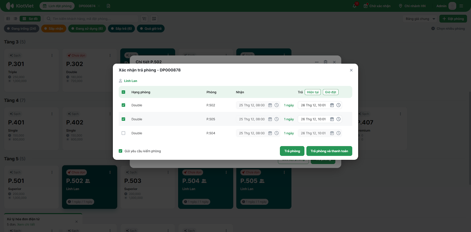 - Chọn Trả phòng hoặc Trả phòng và thanh toán.