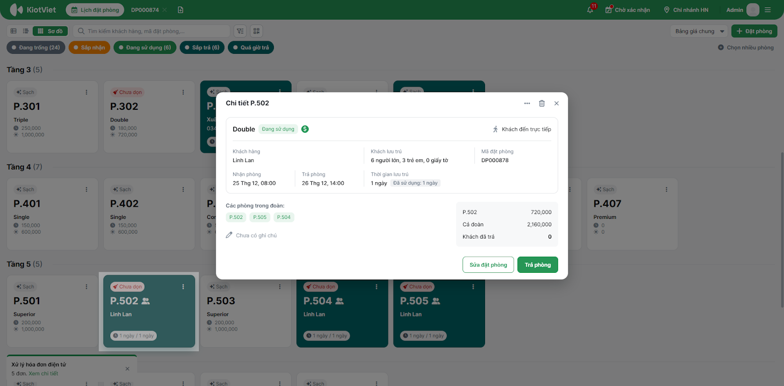 - Thanh toán linh hoạt: Hỗ trợ trả phòng từng phần (từng phòng trong đoàn) hoặc trả phòng toàn bộ và thanh toán gộp.