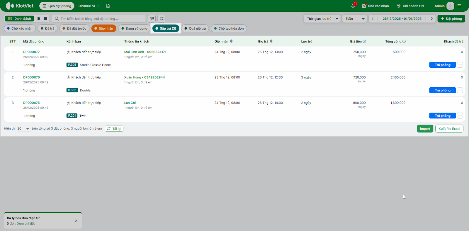 - Hệ thống sẽ hiển thị danh sách các đặt phòng có trạng thái sắp trả, giúp bạn chủ động trong việc chuẩn bị thủ tục.