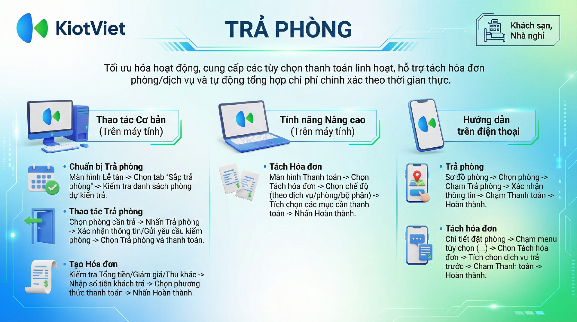 Quy trình Trả phòng (check-out) là bước cuối cùng trong hành trình trải nghiệm của khách hàng tại khách sạn, nhà nghỉ. Một quy trình check-out nhanh chóng, minh bạch về các khoản chi phí không chỉ giúp tối ưu vận hành mà còn để lại ấn tượng tốt đẹp với khách lưu trú.