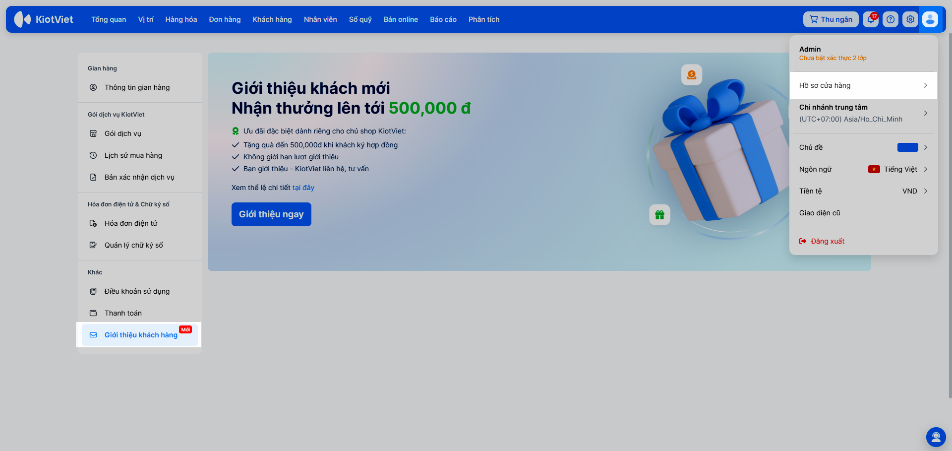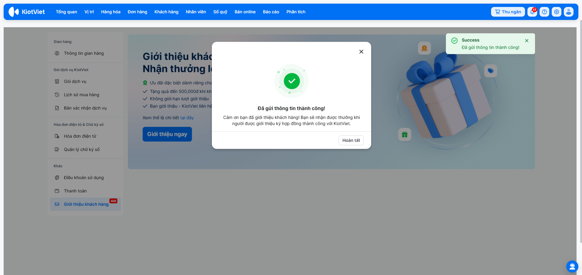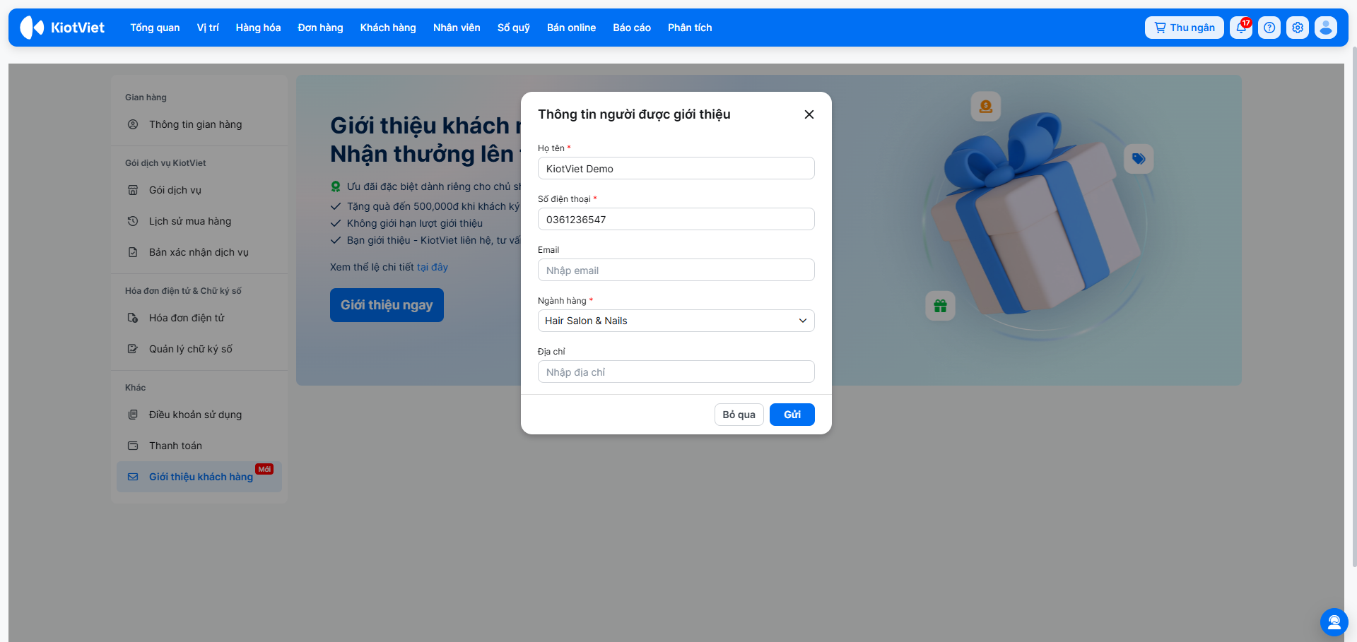 Tính năng này cho phép các khách hàng đang sử dụng KiotViet giới thiệu khách hàng mới và nhận thưởng lên đến 500.000đ khi người được giới thiệu ký hợp đồng thành công. Bạn chỉ cần điền thông tin, KiotViet sẽ đảm nhận việc liên hệ và tư vấn.