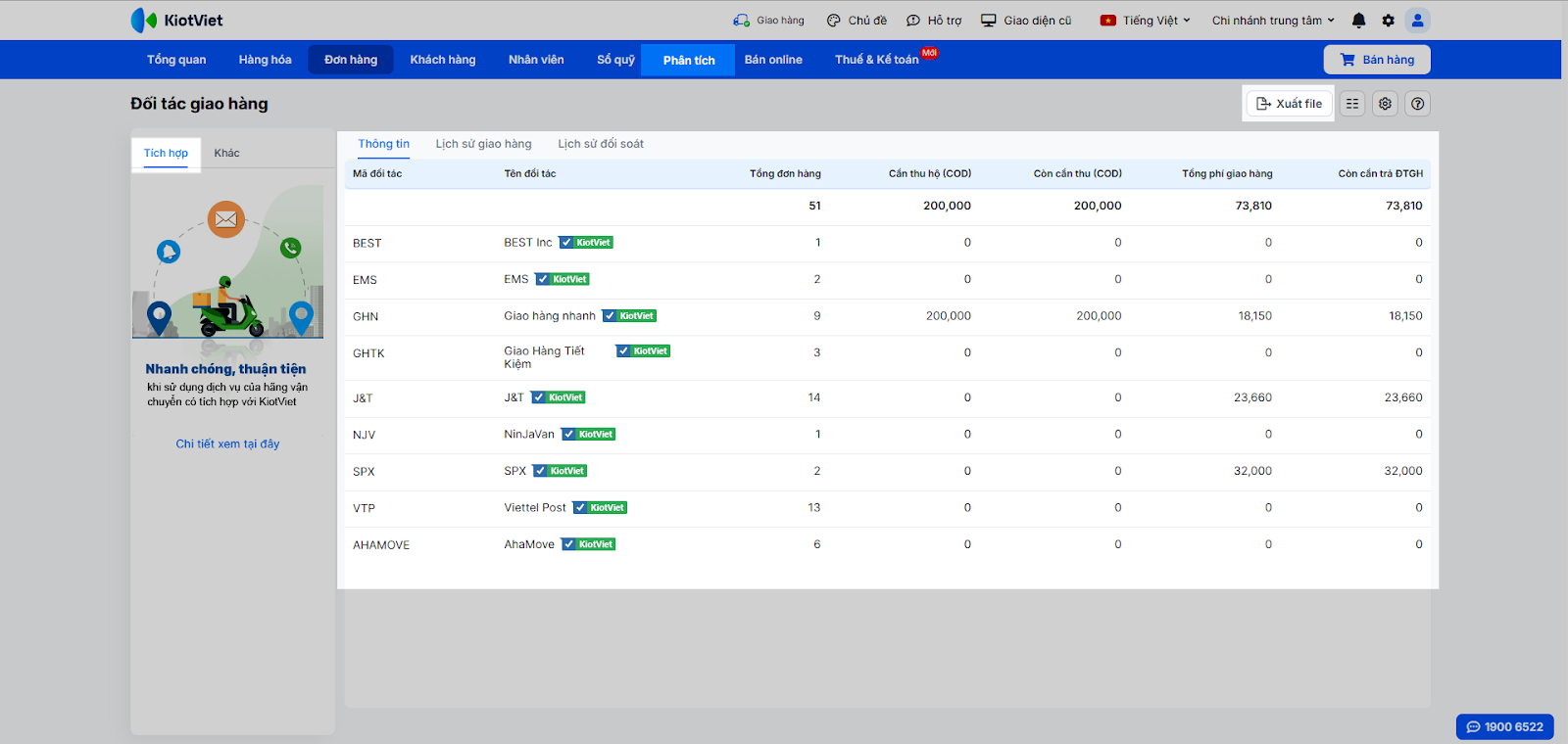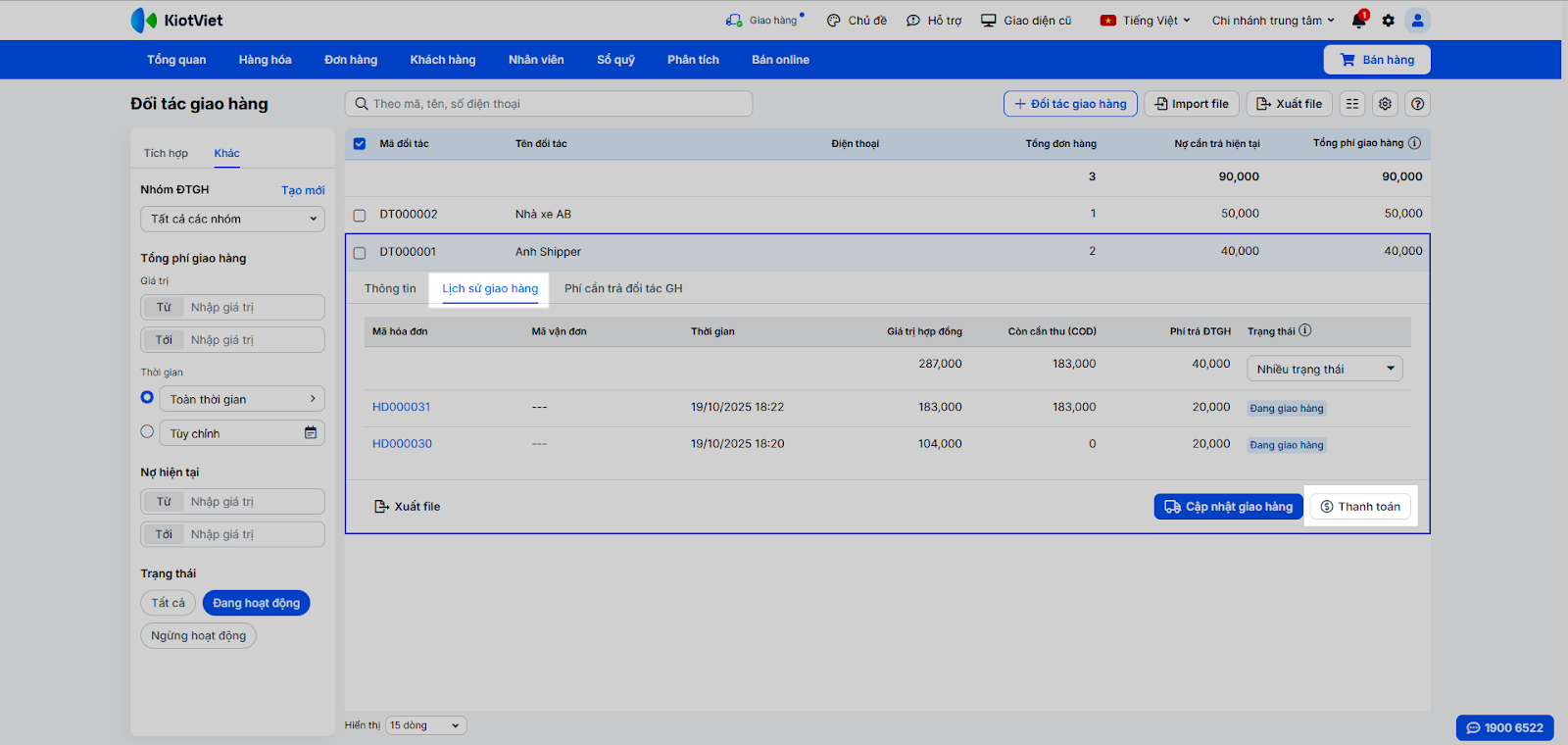 - Tình huống: Khi bạn sử dụng các hãng vận chuyển có tích hợp sẵn với KiotViet, bạn muốn xem toàn bộ lịch sử giao hàng qua các đối tác này ở một nơi duy nhất.