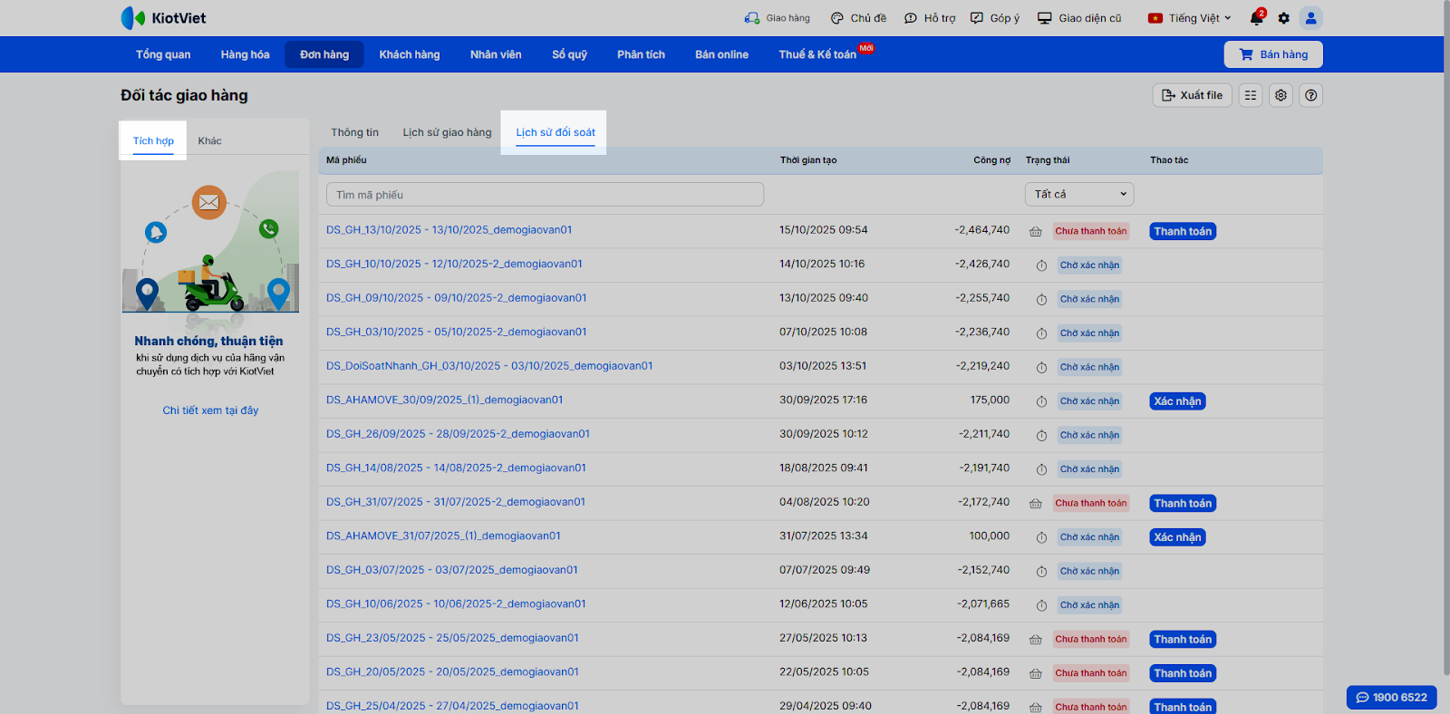 - Tình huống: Các đối tác giao hàng tích hợp sẽ gửi các phiếu đối soát định kỳ. Bạn cần kiểm tra, xác nhận và thực hiện thanh toán các khoản tiền COD thu hộ và phí dịch vụ một cách chính xác.