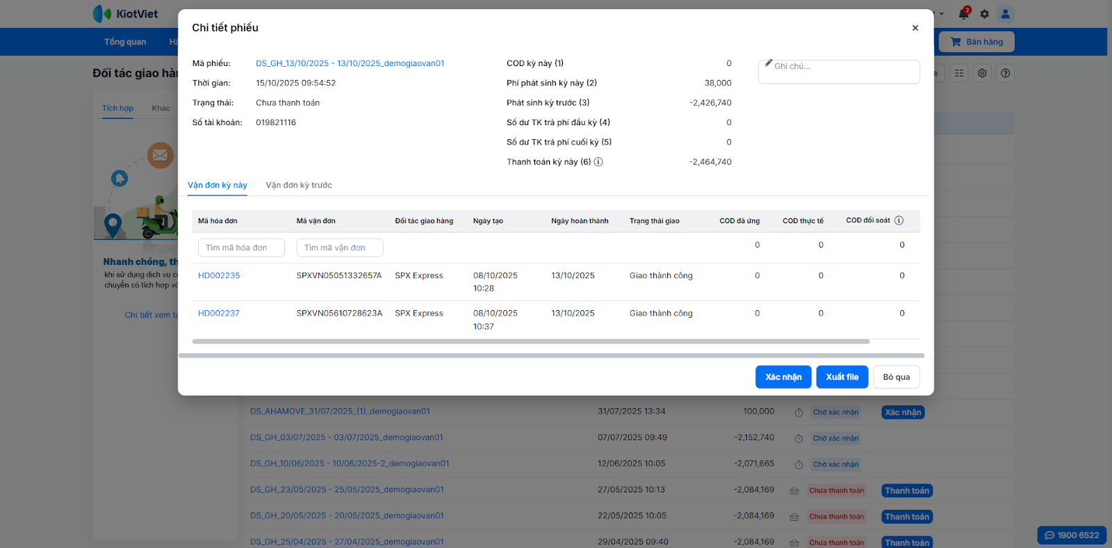 - Trong chi tiết phiếu, hệ thống sẽ phân tích rõ các khoản: COD kỳ này, Phí phải trả, Phát sinh kỳ trước, và số tiền Thanh toán kỳ này.