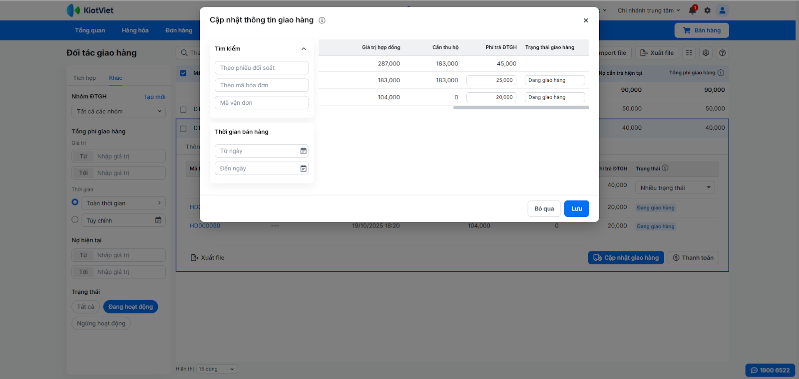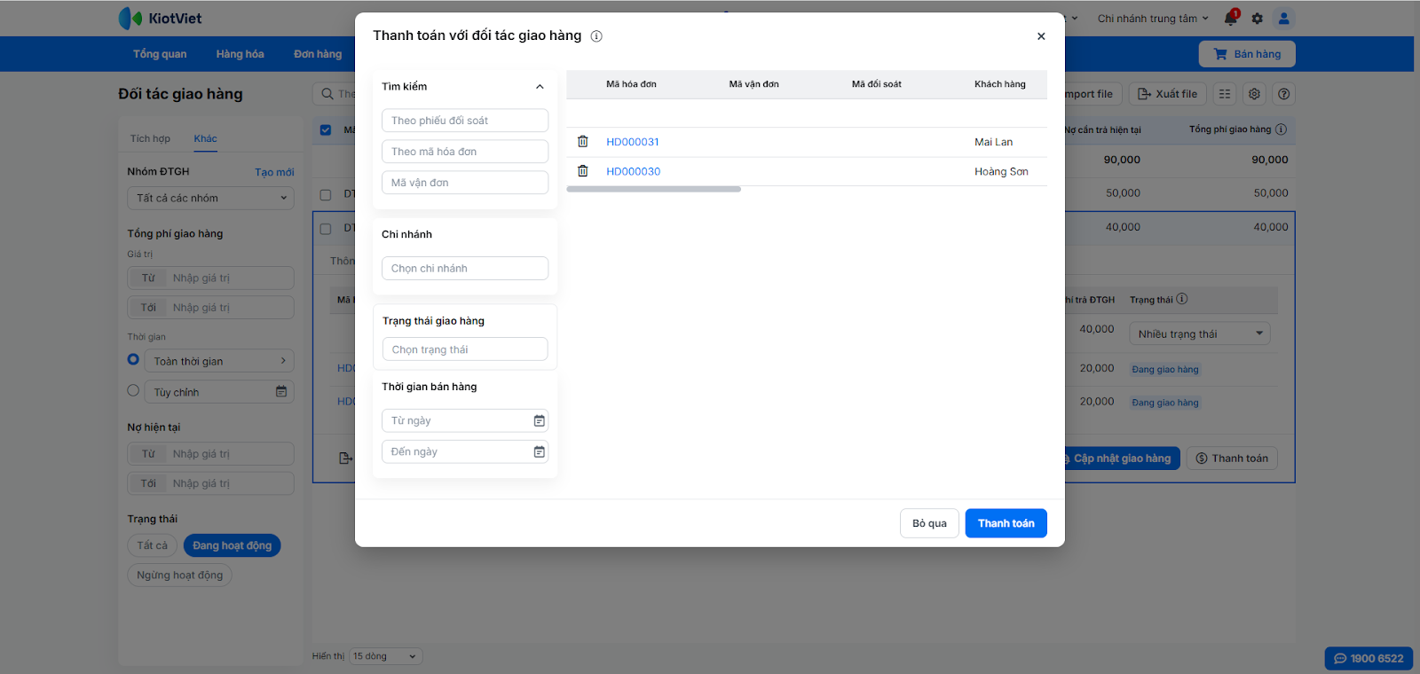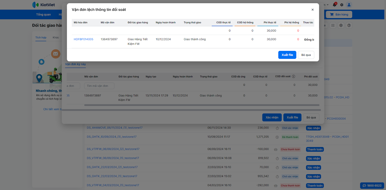 - Nếu có vận đơn bị lệch thông tin: Hệ thống sẽ thông báo. Bạn cần khớp lại thông tin phí hoặc yêu cầu hỗ trợ từ KiotViet trước khi có thể thanh toán.