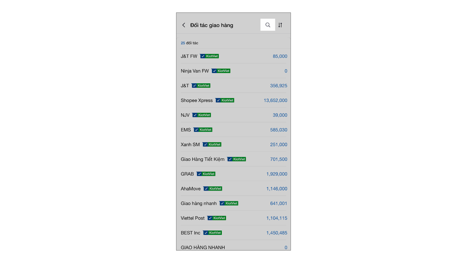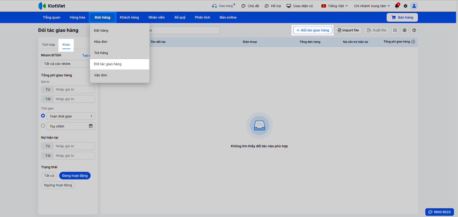 Tính năng Quản lý Đối tác giao hàng giúp bạn theo dõi và quản lý tập trung tất cả các đơn vị vận chuyển, bao gồm cả các hãng vận chuyển (hãng vận chuyển) có tích hợp sẵn với KiotViet và các đối tác giao hàng riêng của cửa hàng.