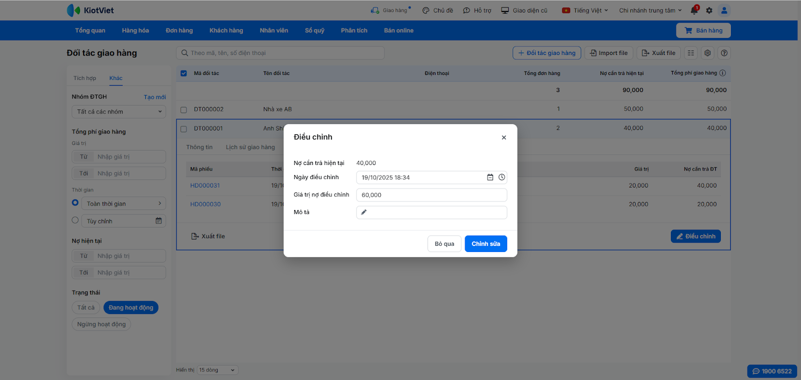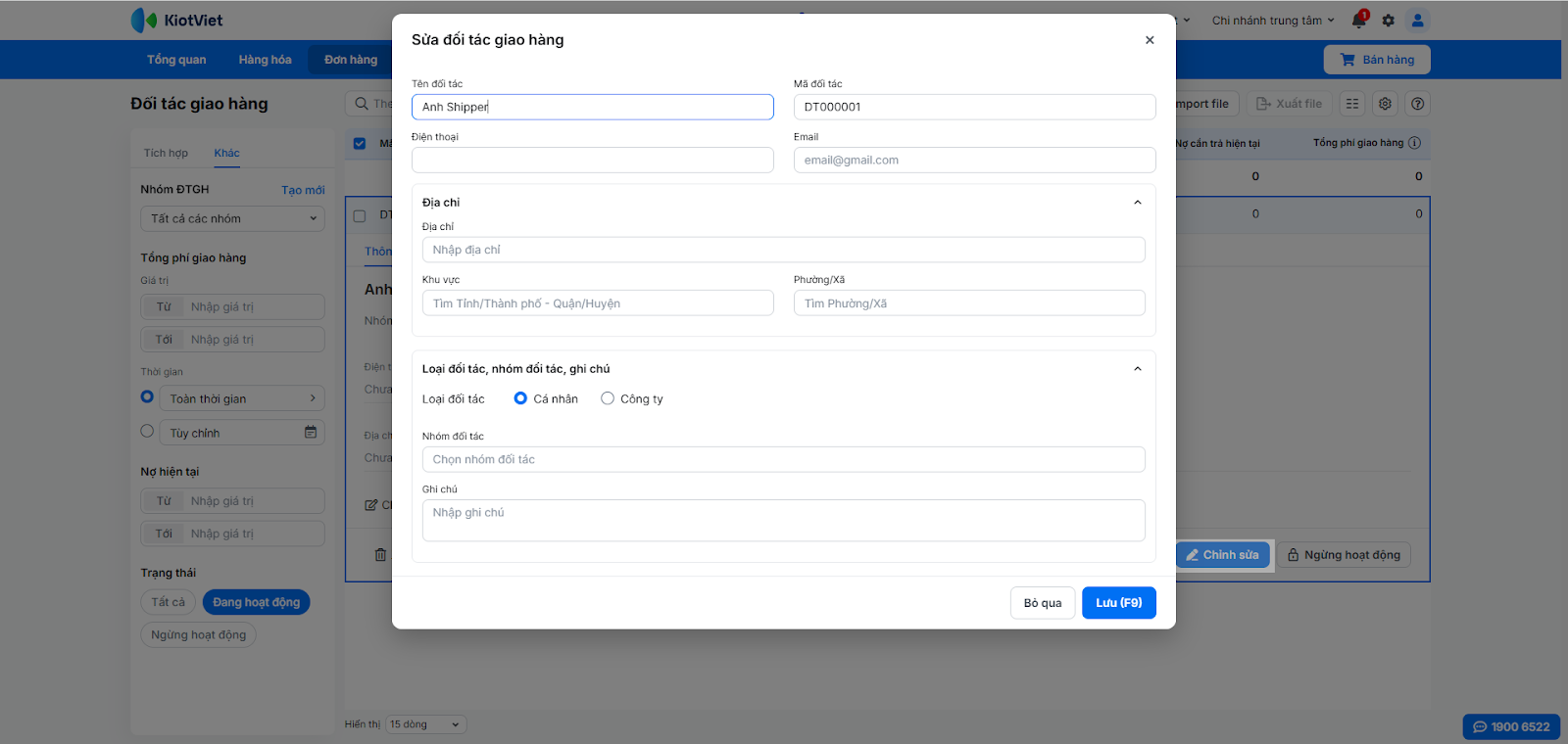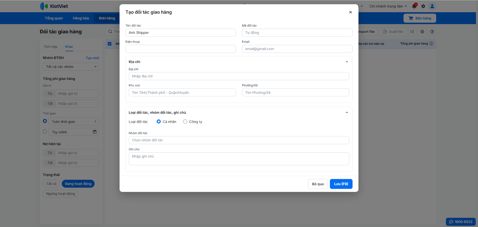 - Tình huống: Khi bạn bắt đầu hợp tác với một đơn vị vận chuyển mới chưa có sẵn trên KiotViet, bạn cần thêm thông tin của họ vào hệ thống để quản lý các đơn hàng và công nợ liên quan.