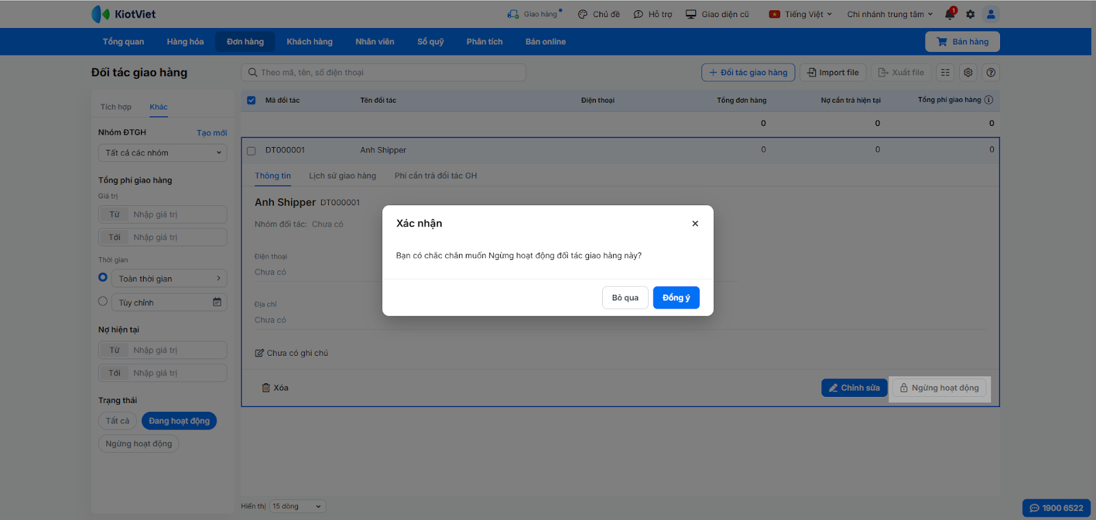 - Nhấn Ngừng hoạt động và Đồng ý để xác nhận. Đối tác sẽ không thể được chọn cho các giao dịch mới nhưng thông tin cũ vẫn được lưu trữ.