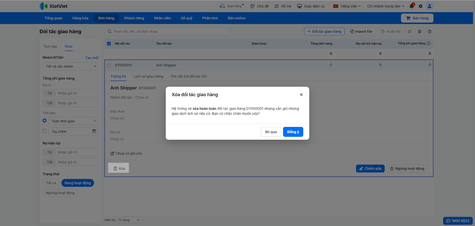 - Nhấn Xóa và Đồng ý để xác nhận. Lưu ý: Hệ thống sẽ xóa hoàn toàn thông tin đối tác, nhưng các giao dịch lịch sử liên quan vẫn được giữ lại và tên đối tác sẽ có thêm hậu tố {DEL}.