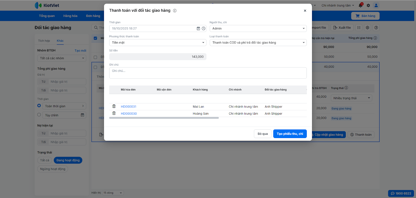 Bạn có thể chọn lại Loại thanh toán: Tiền thu hộ (COD) hoặc Phí trả đổi tác giao hàng để Tạo phiếu thu hoặc Tạo phiếu chi tương ứng.