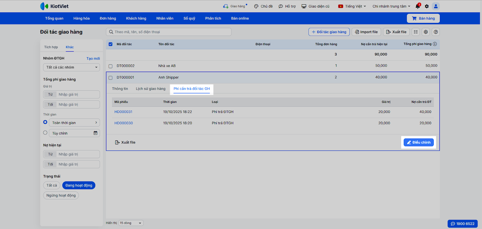 - Sử dụng thanh tìm kiếm theo mã, tên, số điện thoại cửa đối tác giao hàng và bộ lọc như: Nhóm ĐTGH, Tổng phí giao hàng, Thời gian, Nợ hiện tại, Trạng thái để tìm kiếm thông tin.