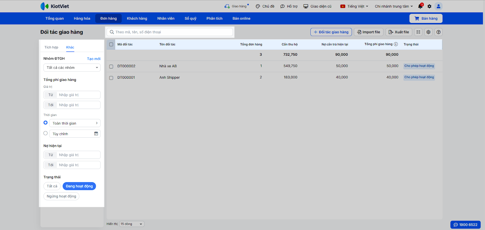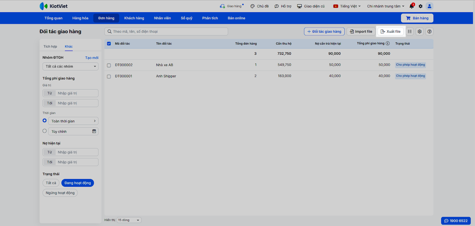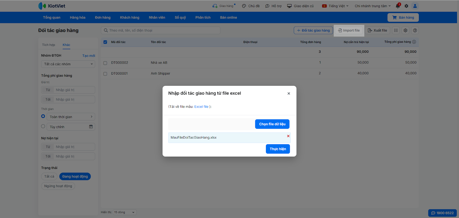 - Tình huống: Khi bạn mới bắt đầu sử dụng KiotViet và đã có sẵn một danh sách các đối tác giao hàng, bạn muốn nhập hàng loạt danh sách này vào hệ thống để tiết kiệm thời gian. Hoặc bạn cần xuất danh sách ra để làm báo cáo.