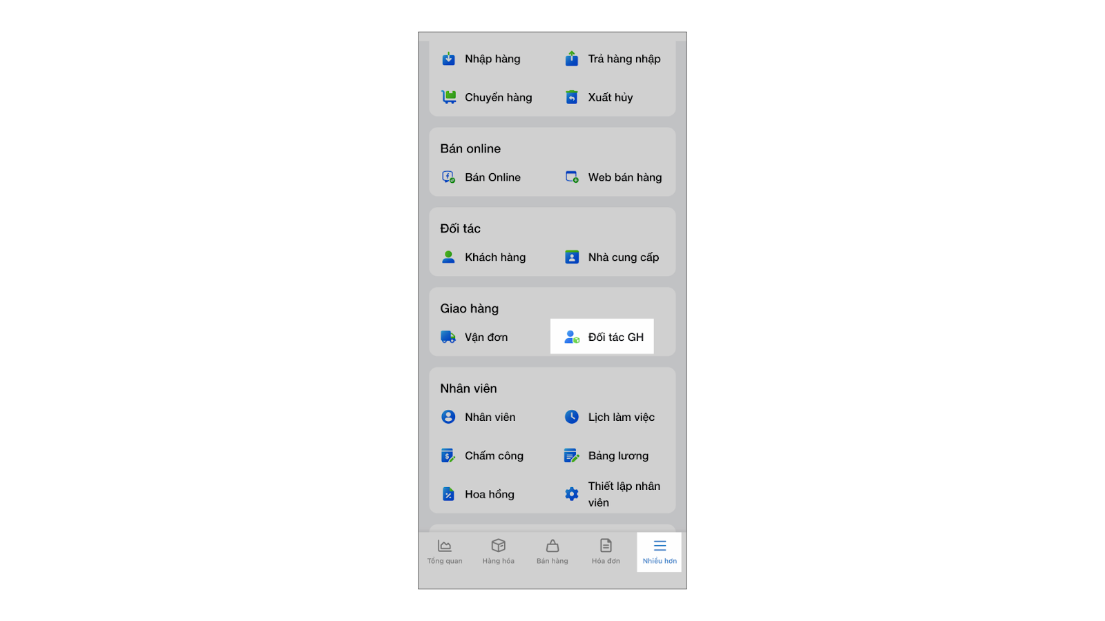 - Mở ứng dụng KiotViet, vào menu Nhiều hơn → Đối tác GH.