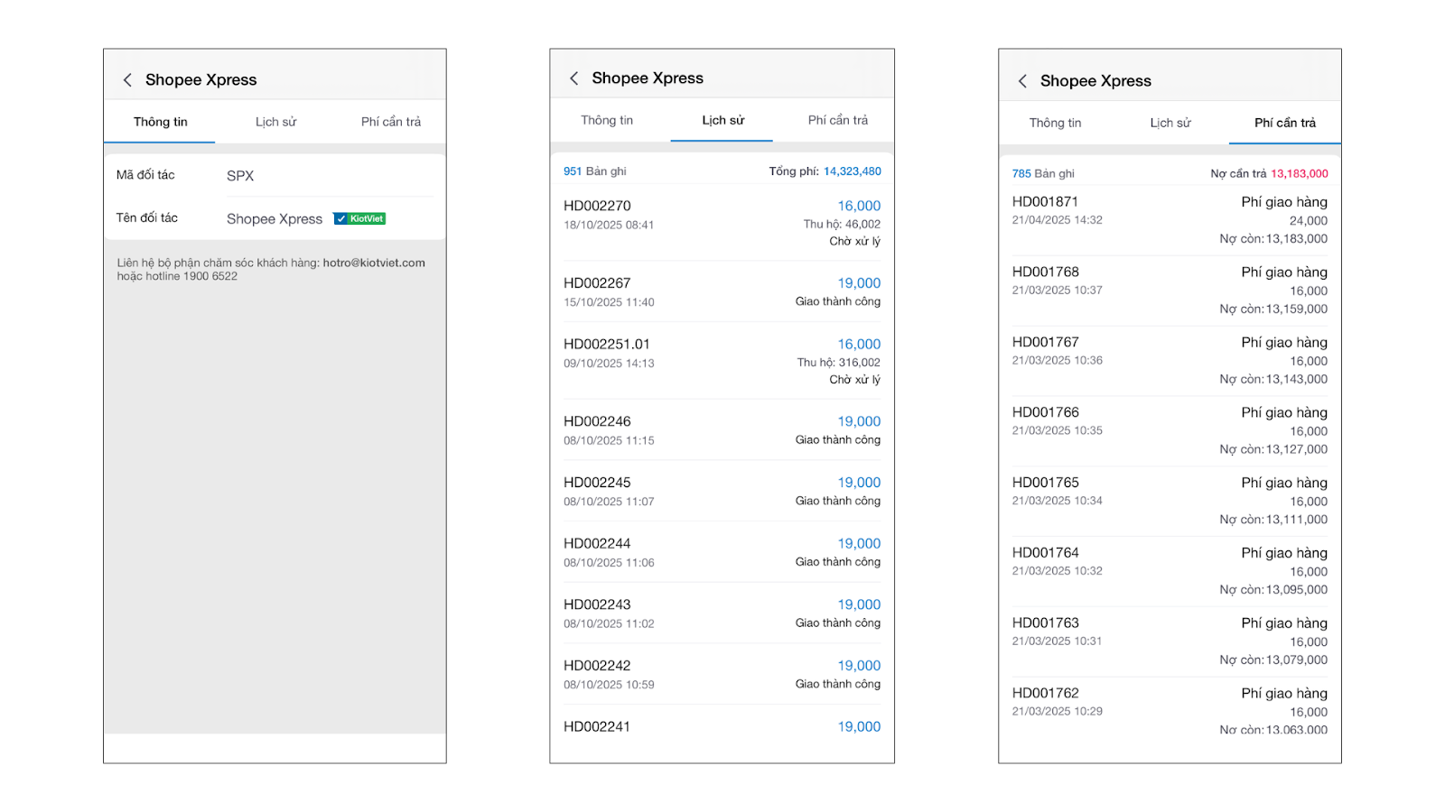 - Chạm vào tên đối tác để xem Thông tin chi tiết, Lịch sử giao dịch, Phí cần trả.