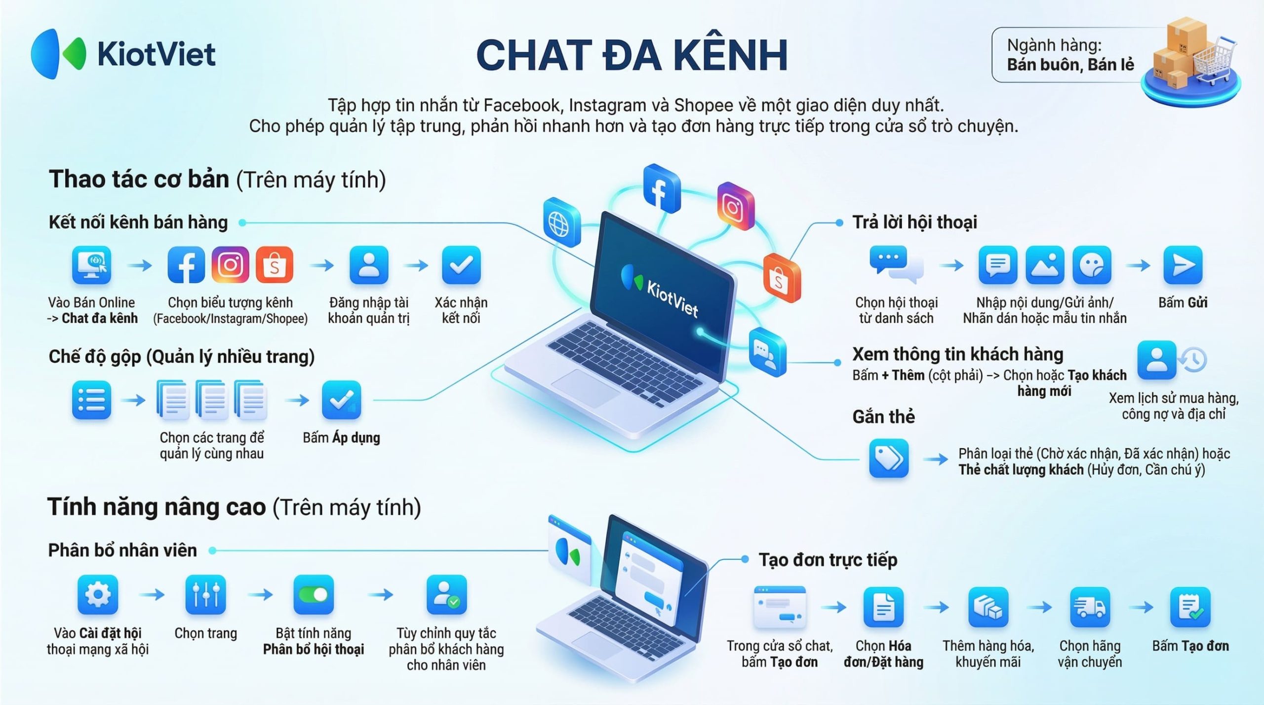 - Quản lý tất cả trong một: Hợp nhất tin nhắn, bình luận từ Facebook Fanpage, Instagram và Shopee Chat vào một màn hình duy nhất.