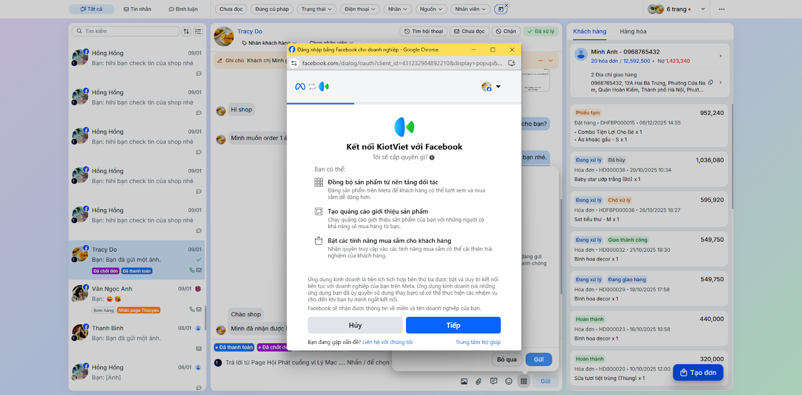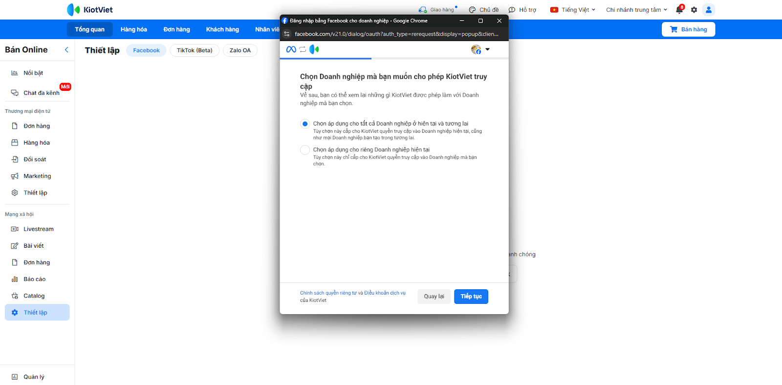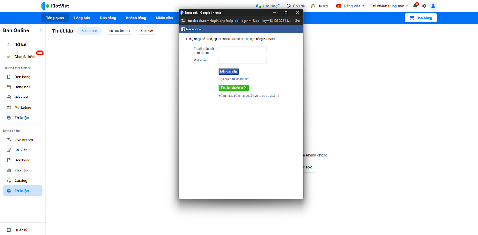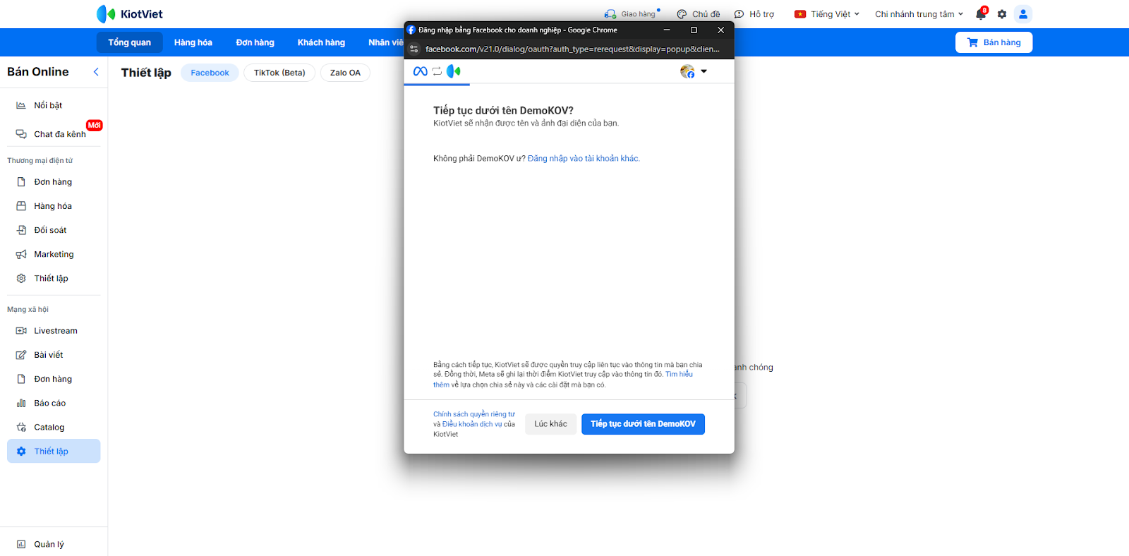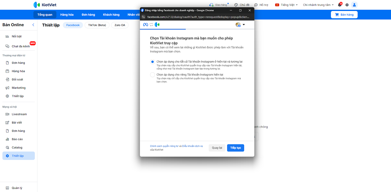 - Tình huống: Bạn cần kết nối tài khoản Facebook/Instagram/Shopee với KiotViet để phần mềm có thể truy cập vào hội thoại trên các nền tảng này.