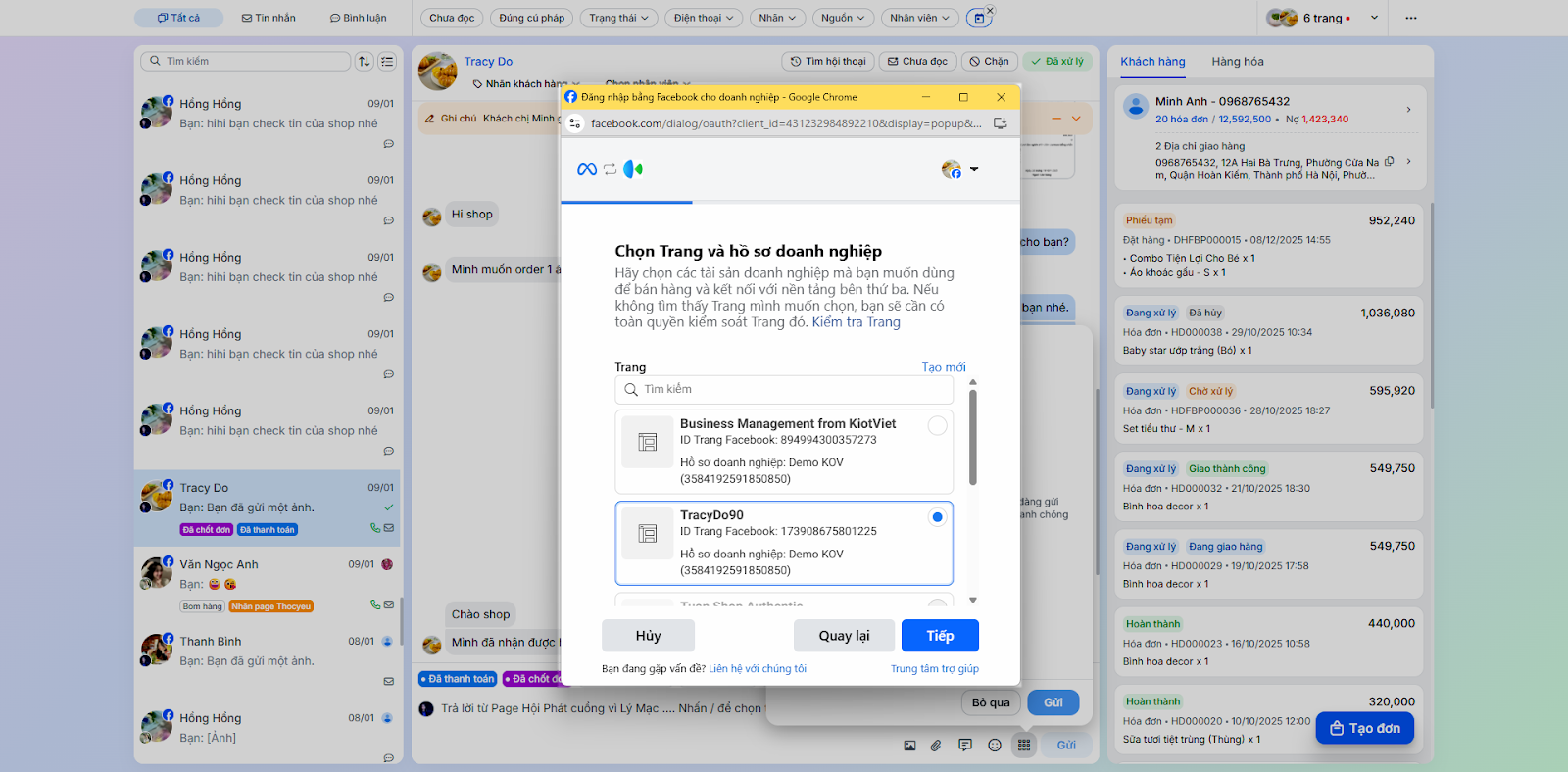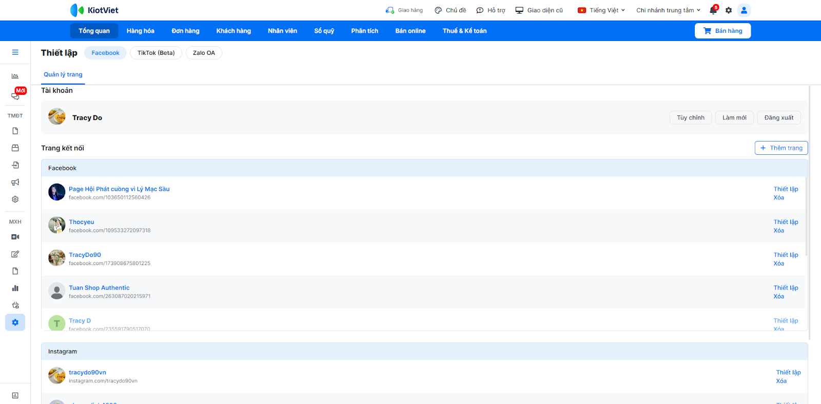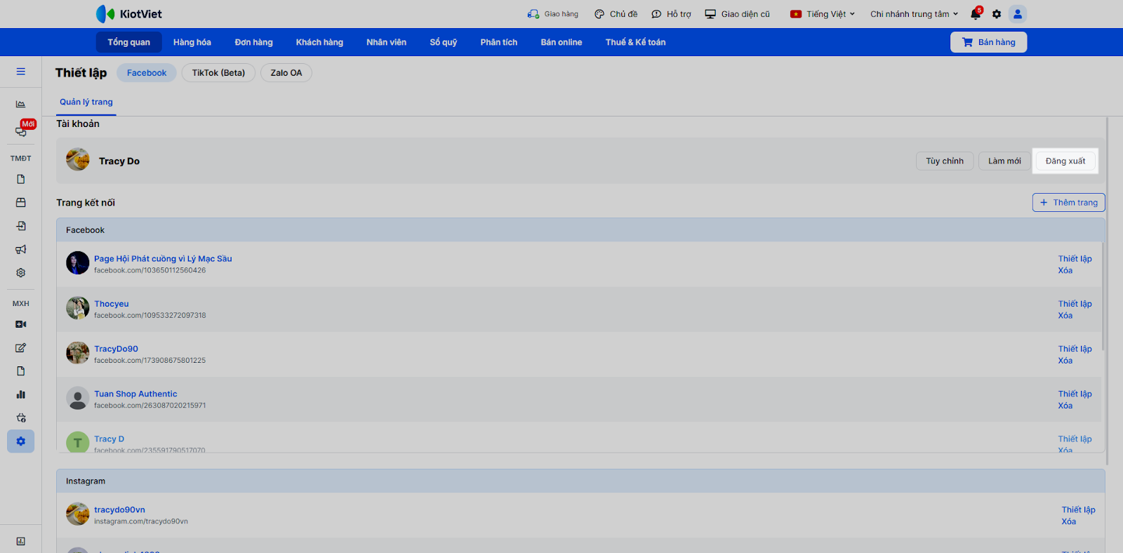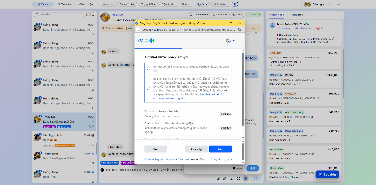 - Tình huống: Bạn cần kết nối tài khoản Facebook/Instagram/Shopee với KiotViet để phần mềm có thể truy cập vào hội thoại trên các nền tảng này.