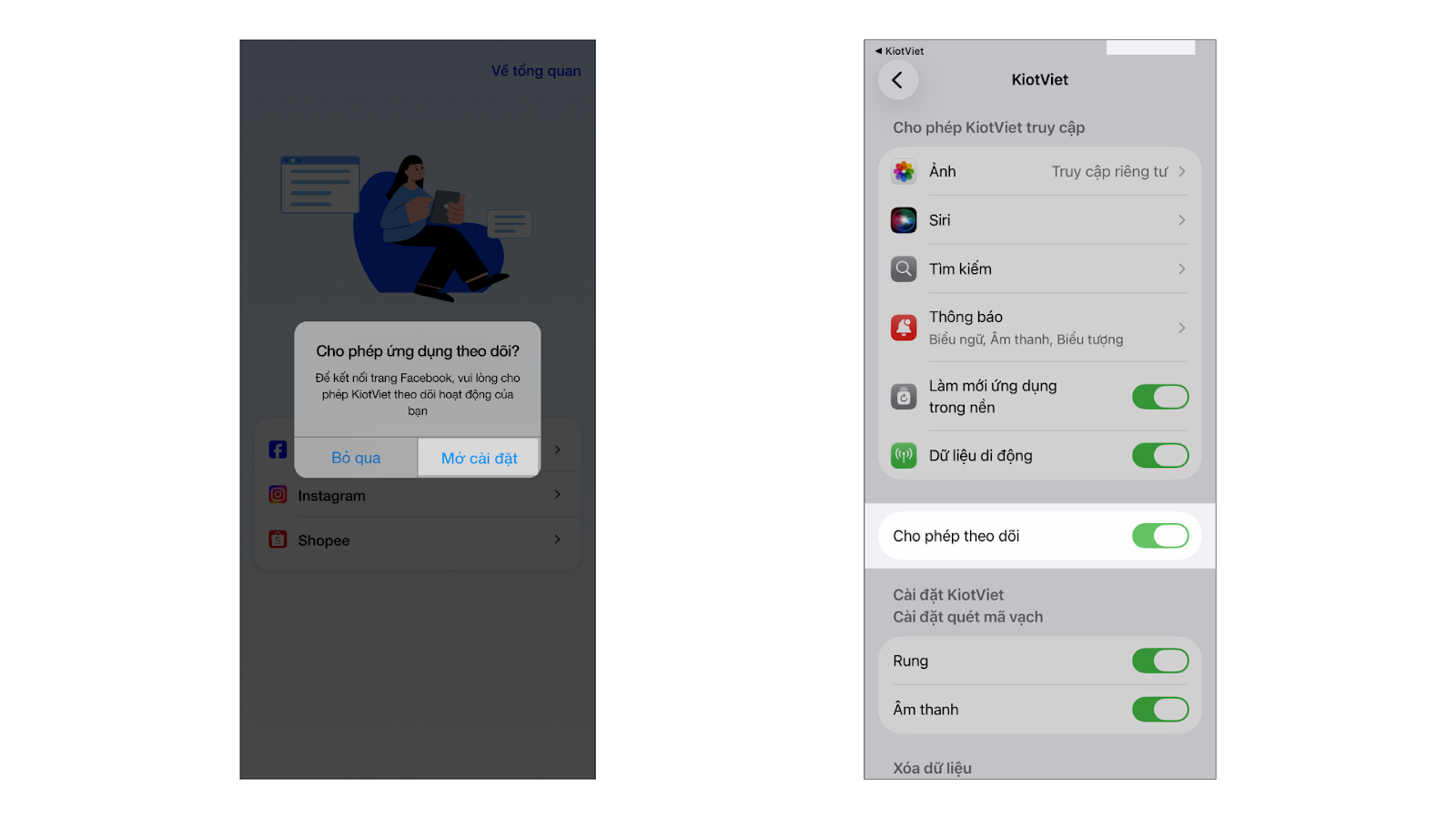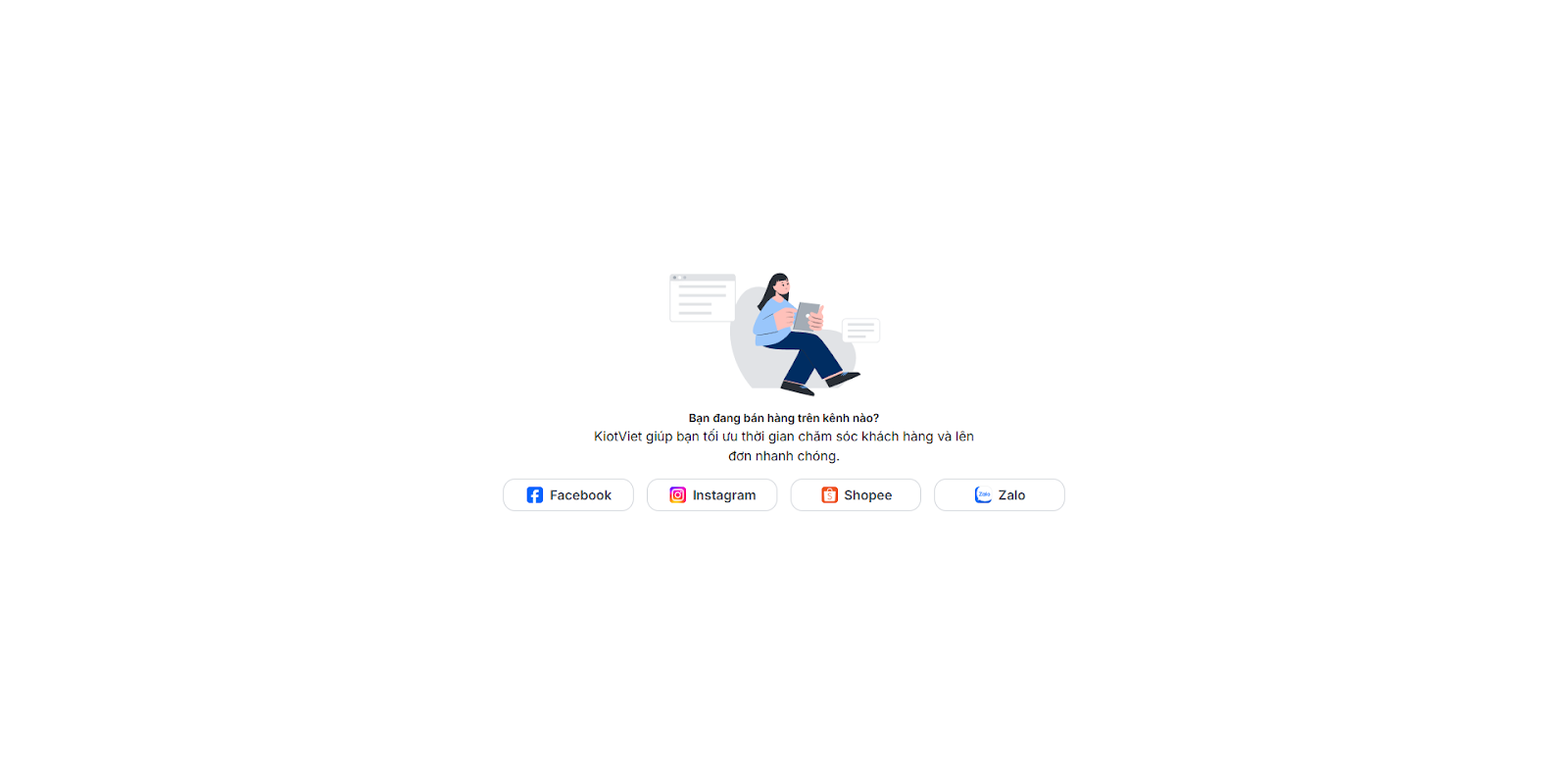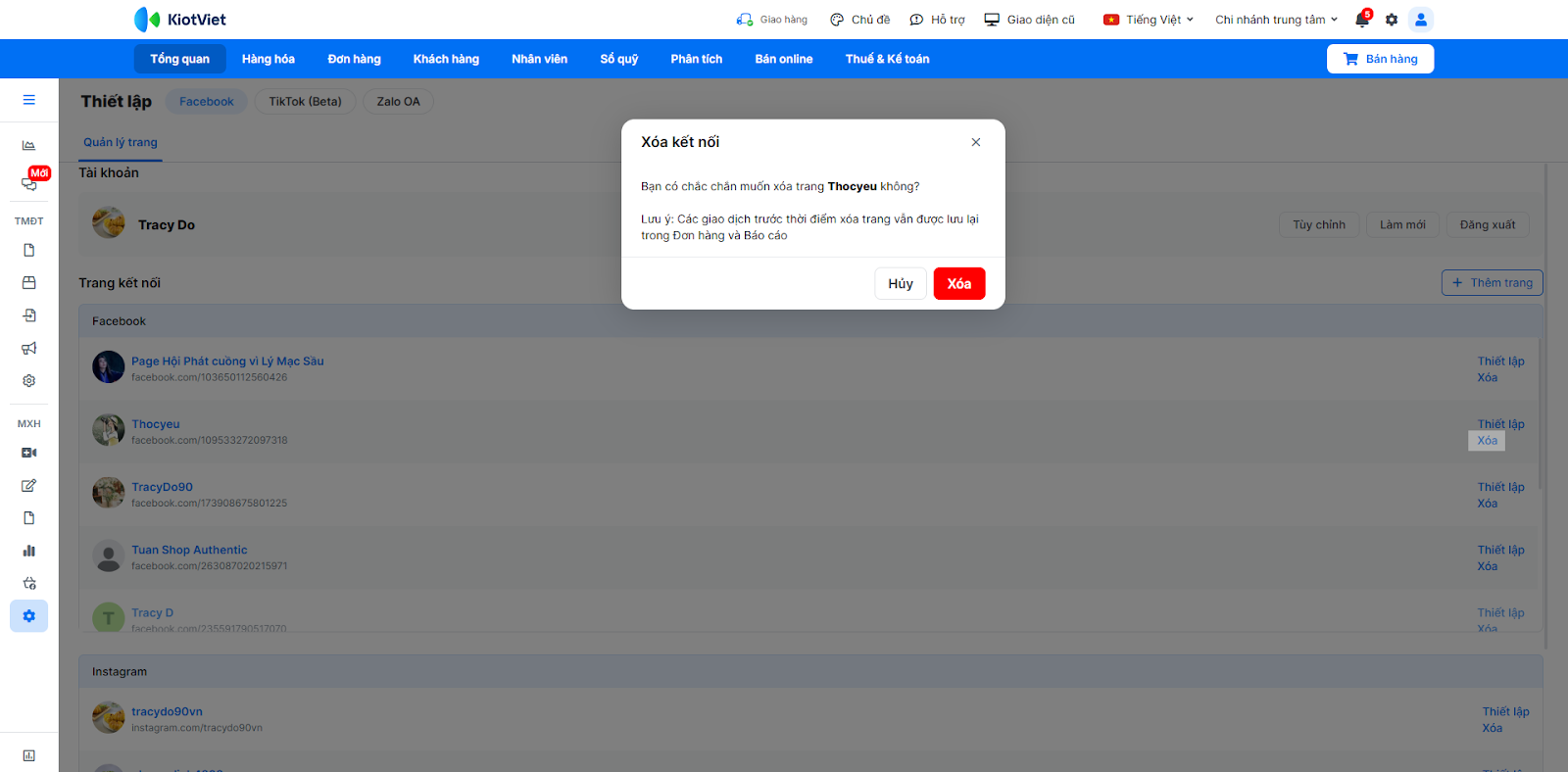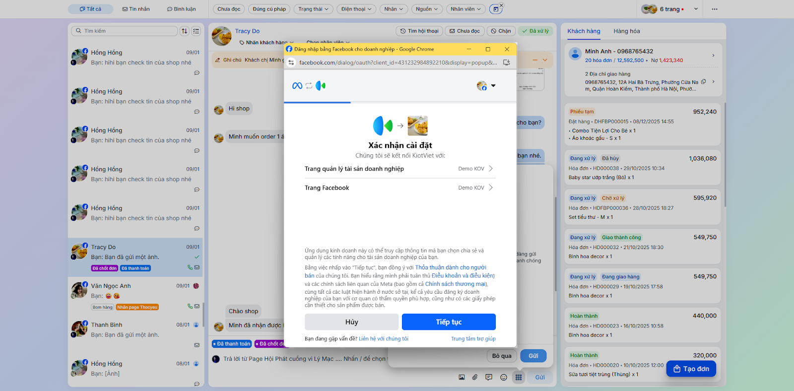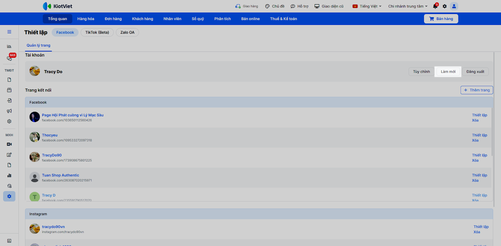 - Tình huống: Bạn cần kết nối tài khoản Facebook/Instagram/Shopee với KiotViet để phần mềm có thể truy cập vào hội thoại trên các nền tảng này.