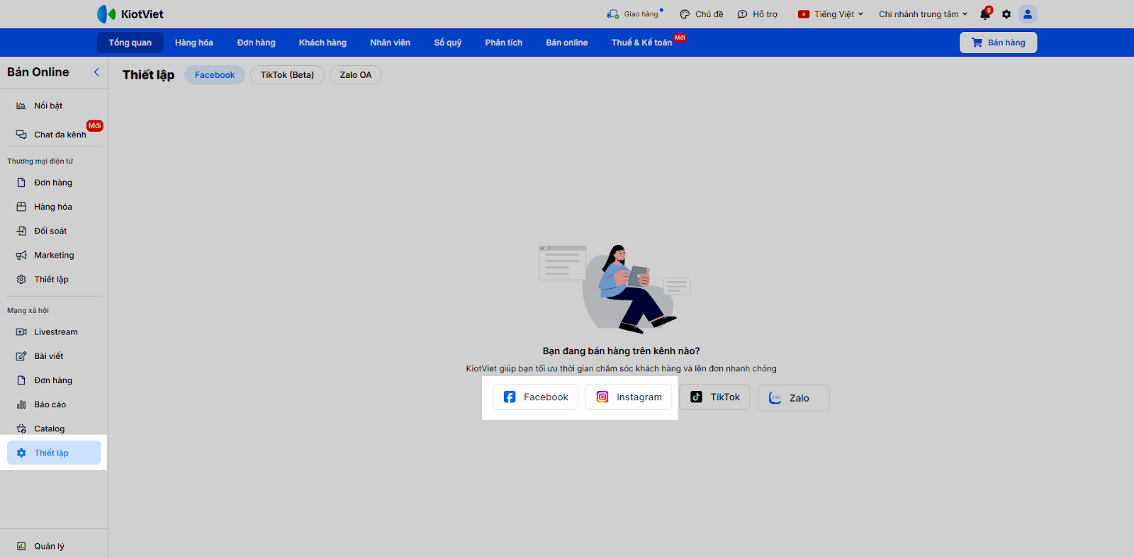 - Hệ thống chuyển đến màn hình Thiết lập trong khối Mạng xã hội → bạn nhấn vào biểu tượng kênh bán tương ứng.