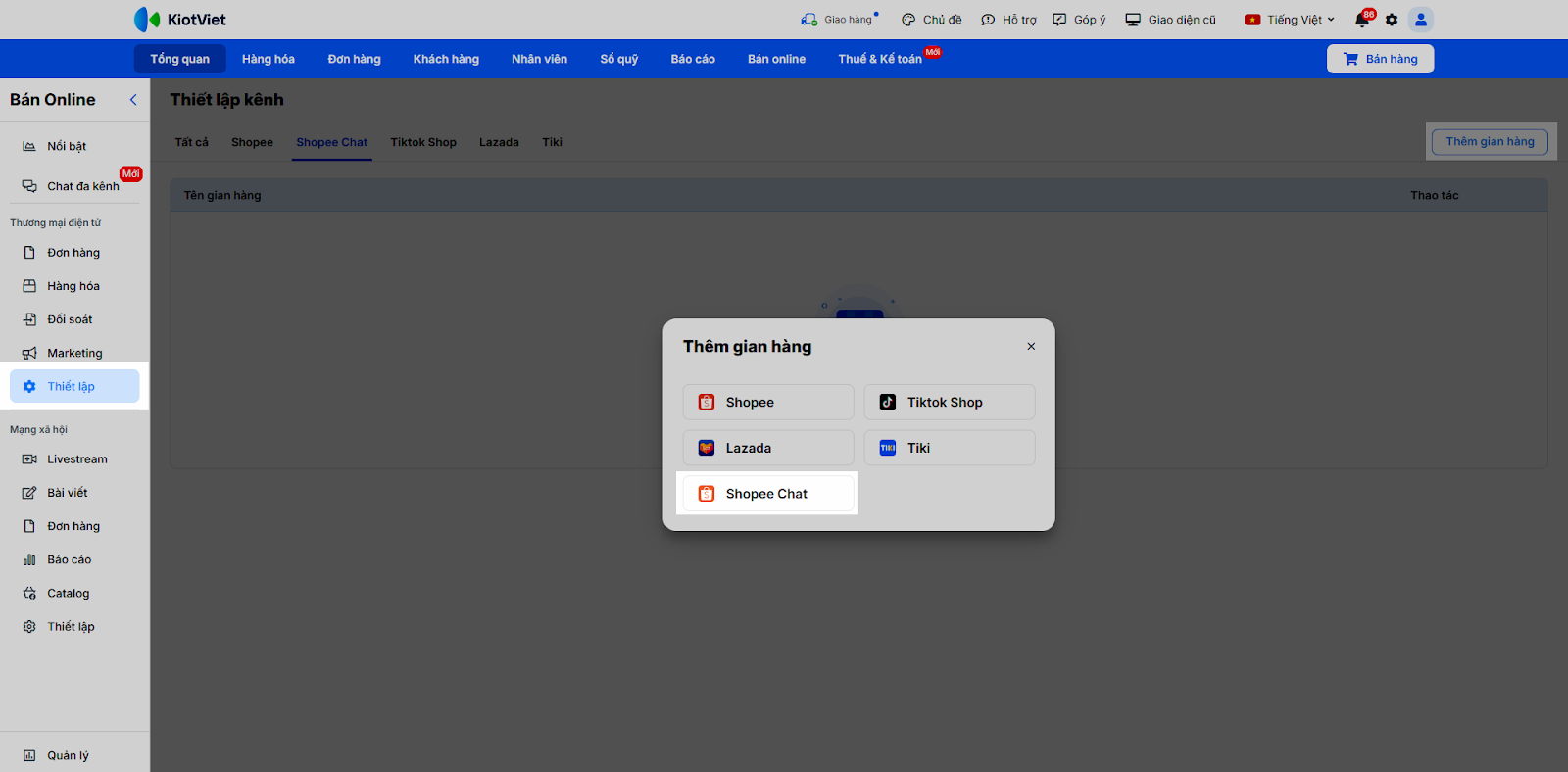 - Hệ thống chuyển đến màn hình Thiết lập trong khối Thương mại điện tử → bạn nhấn Thêm gian hàng → chọn Shopee Chat.
