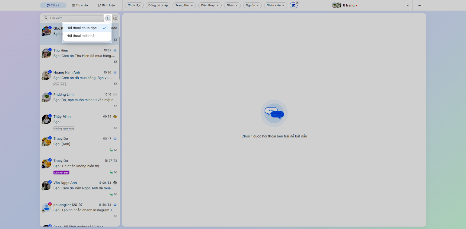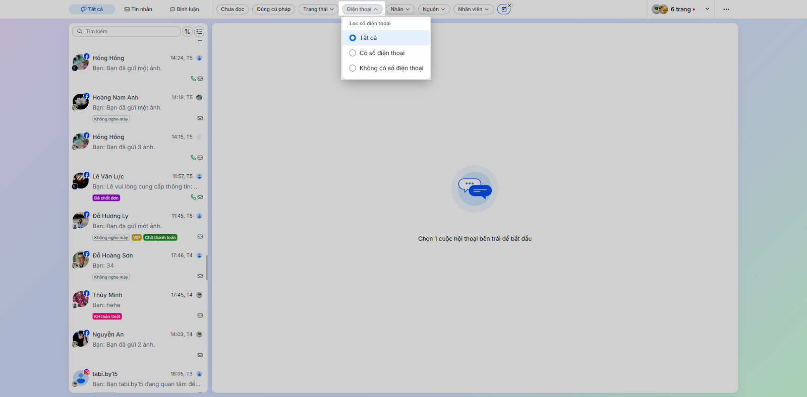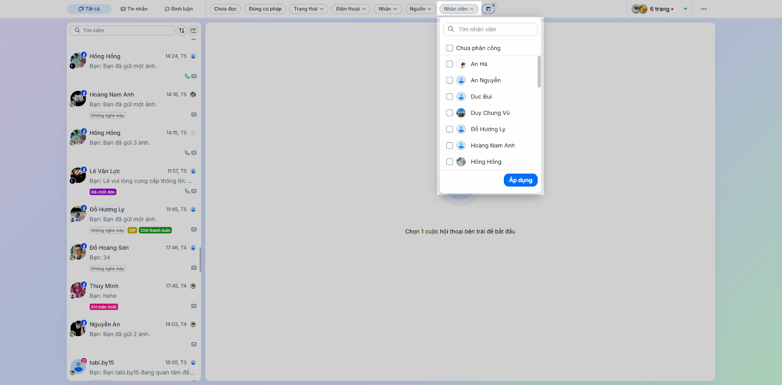- Nhân viên: Lọc các hội thoại được phân công nhân viên cụ thể.