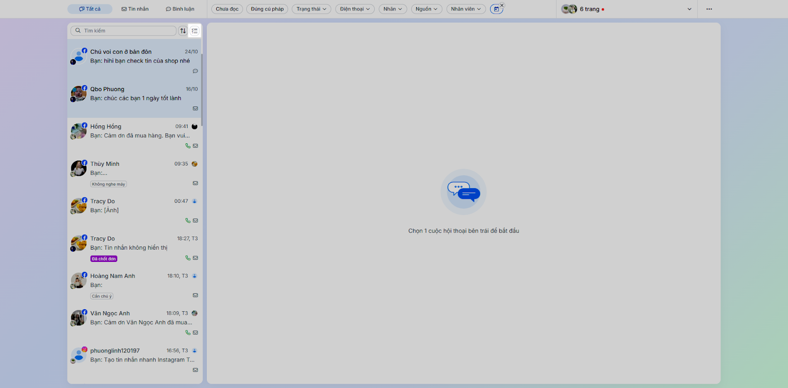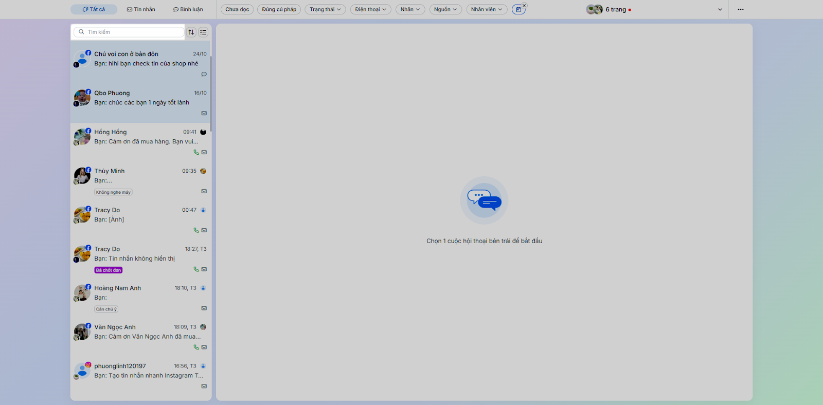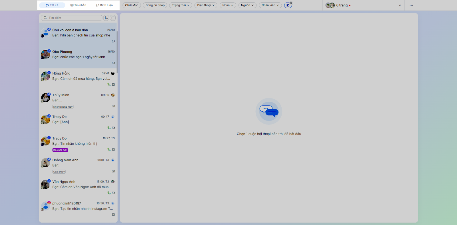 - Nhân viên: Lọc các hội thoại được phân công nhân viên cụ thể.