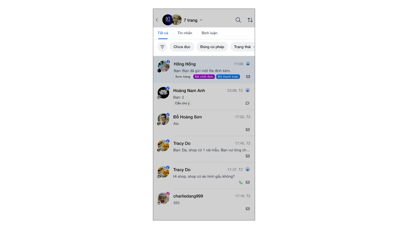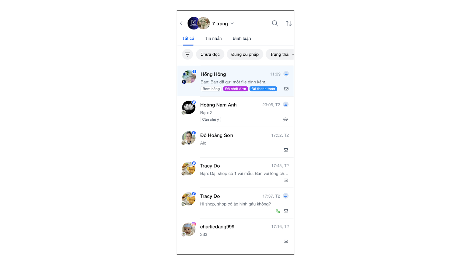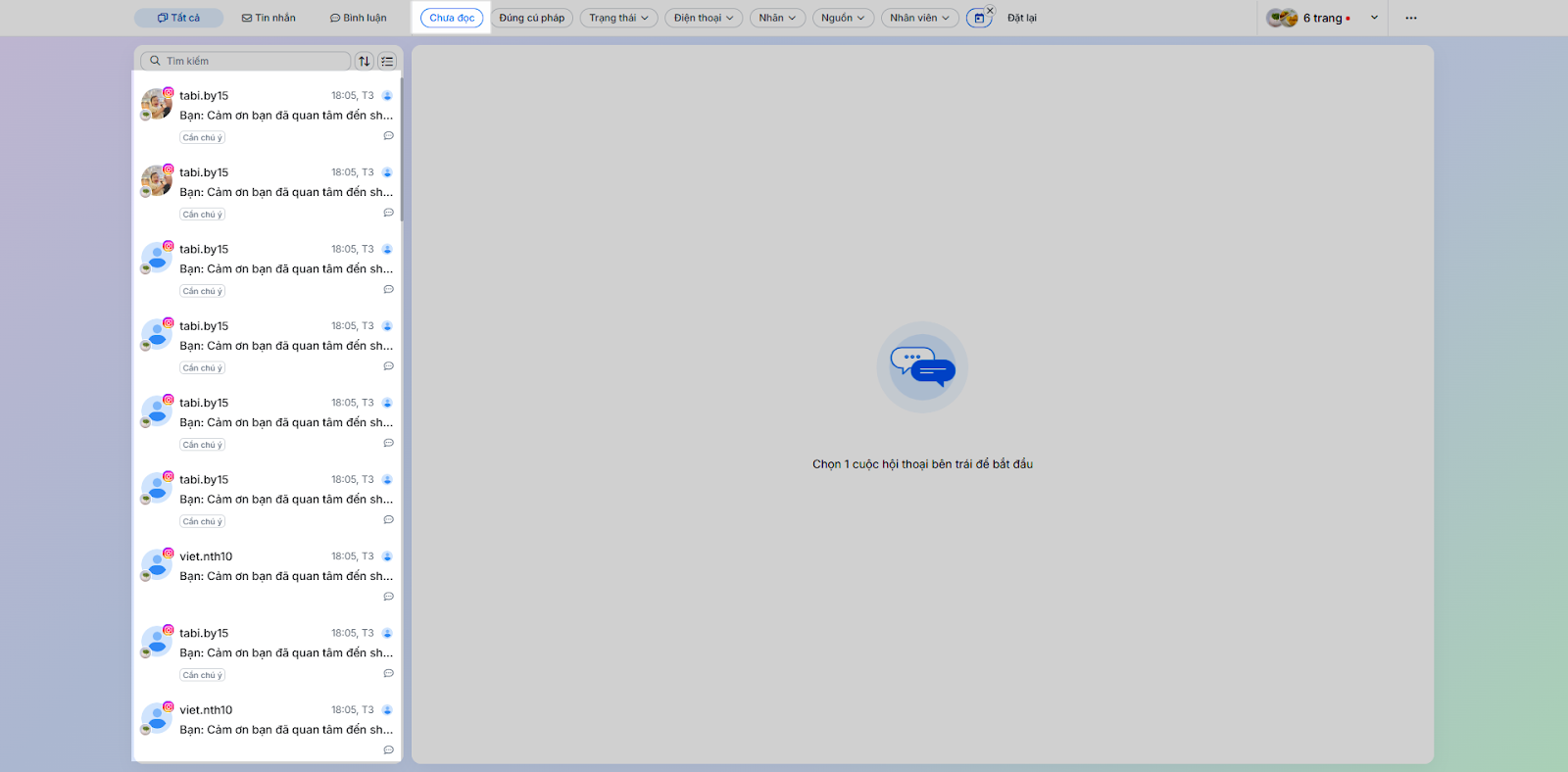 - Chưa đọc: Lọc ra các hội thoại có trạng thái chưa đọc.