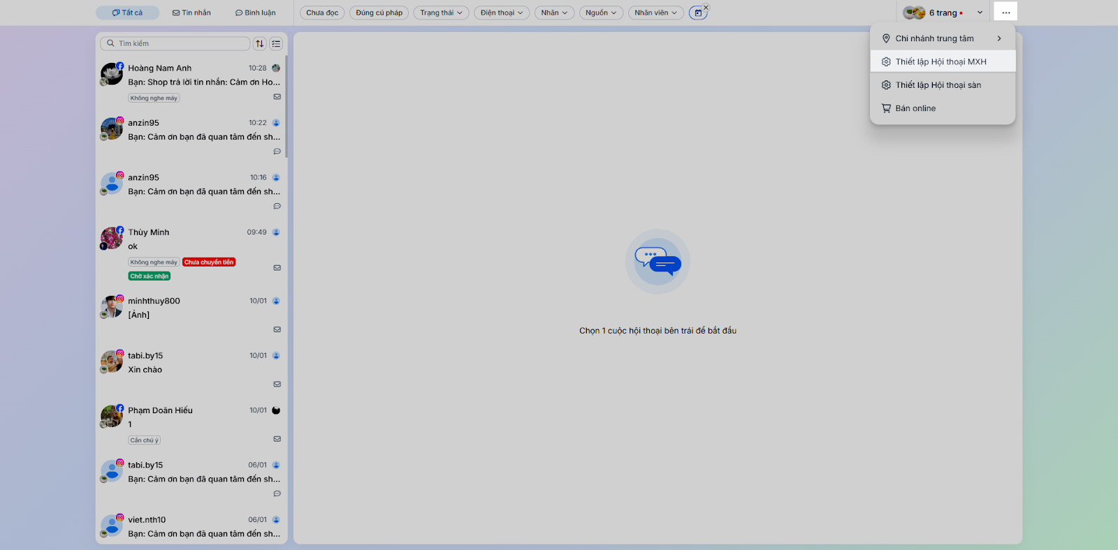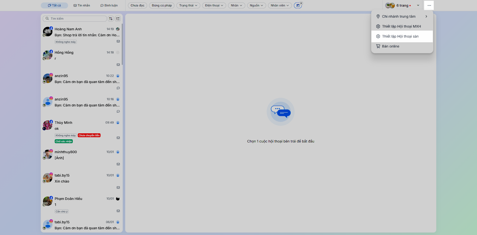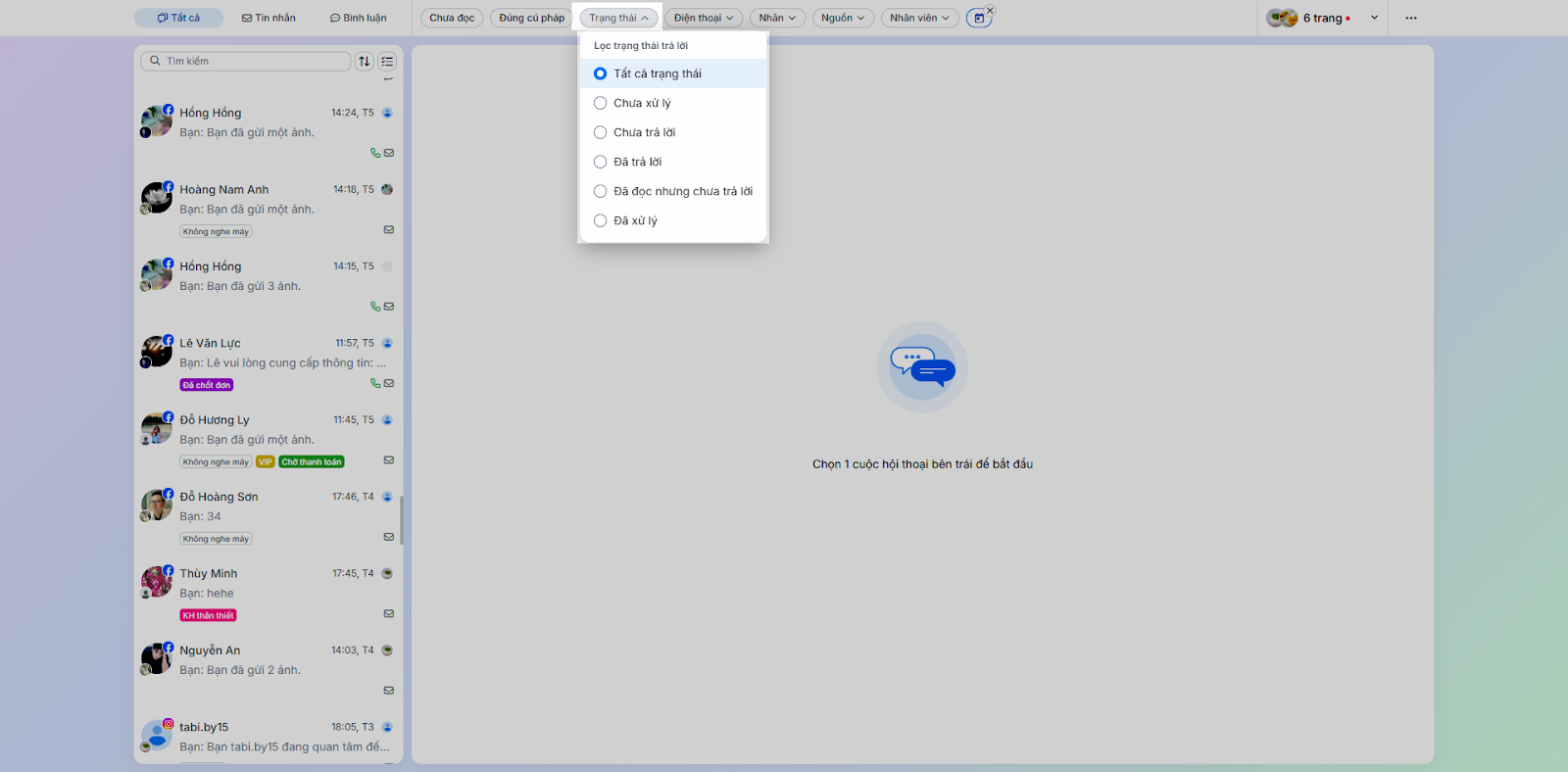 - Trạng thái trả lời: Lọc các hội thoại theo trạng thái xử lý (ví dụ: Đang trao đổi, Chờ xử lý…).