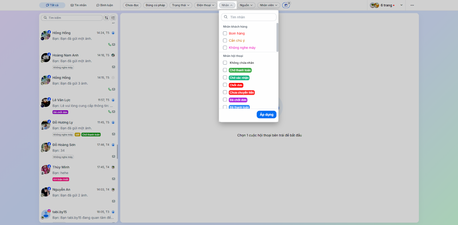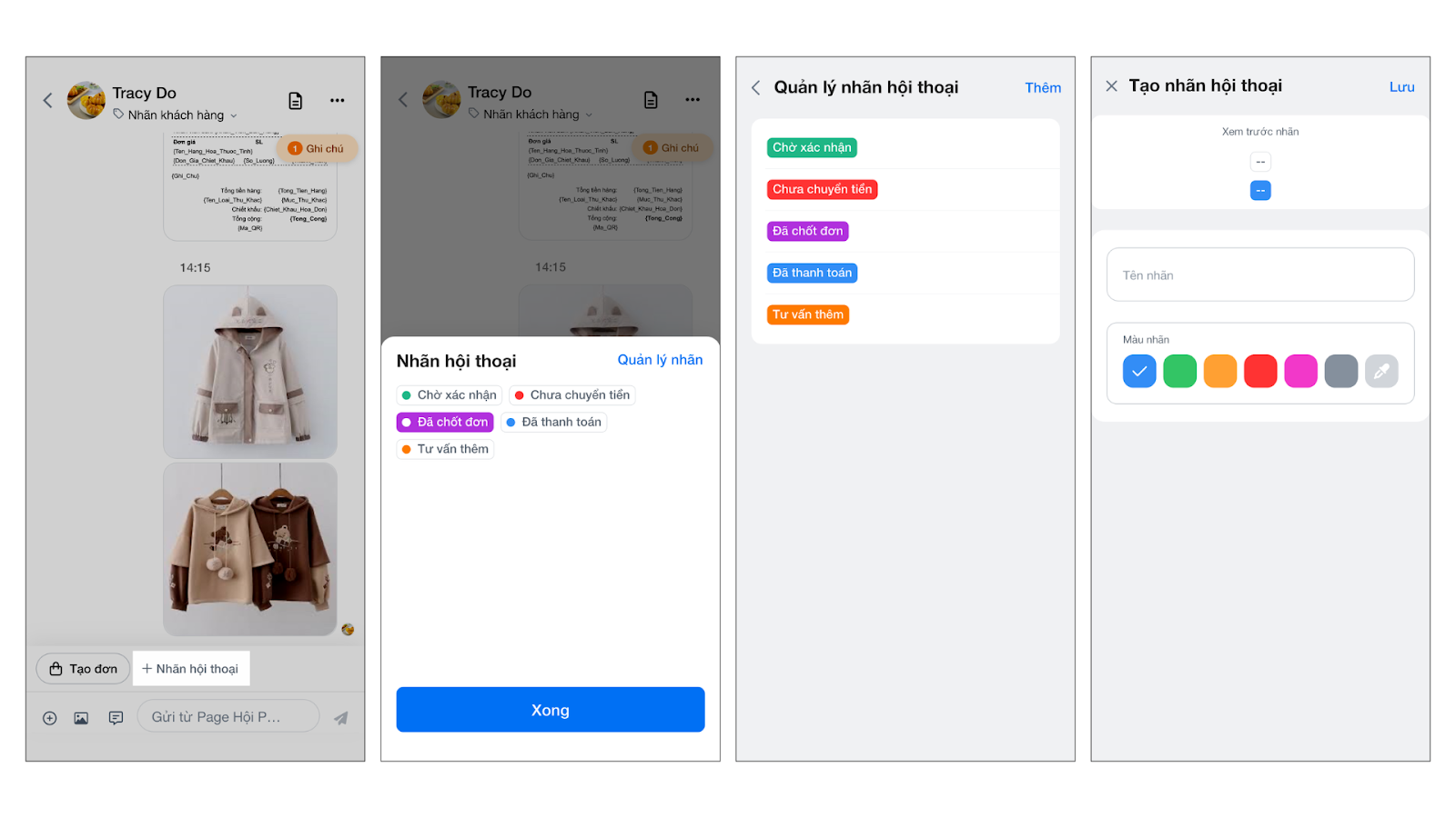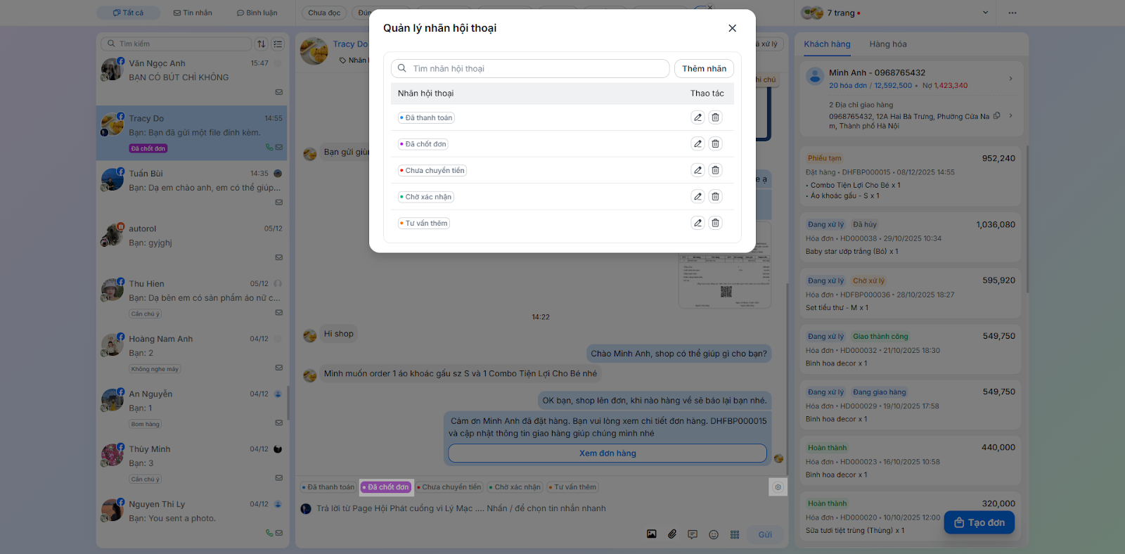 - Gán nhãn hội thoại: Giúp phân loại hội thoại dễ dàng (ví dụ: Chờ xác nhận, Đã chốt đơn).