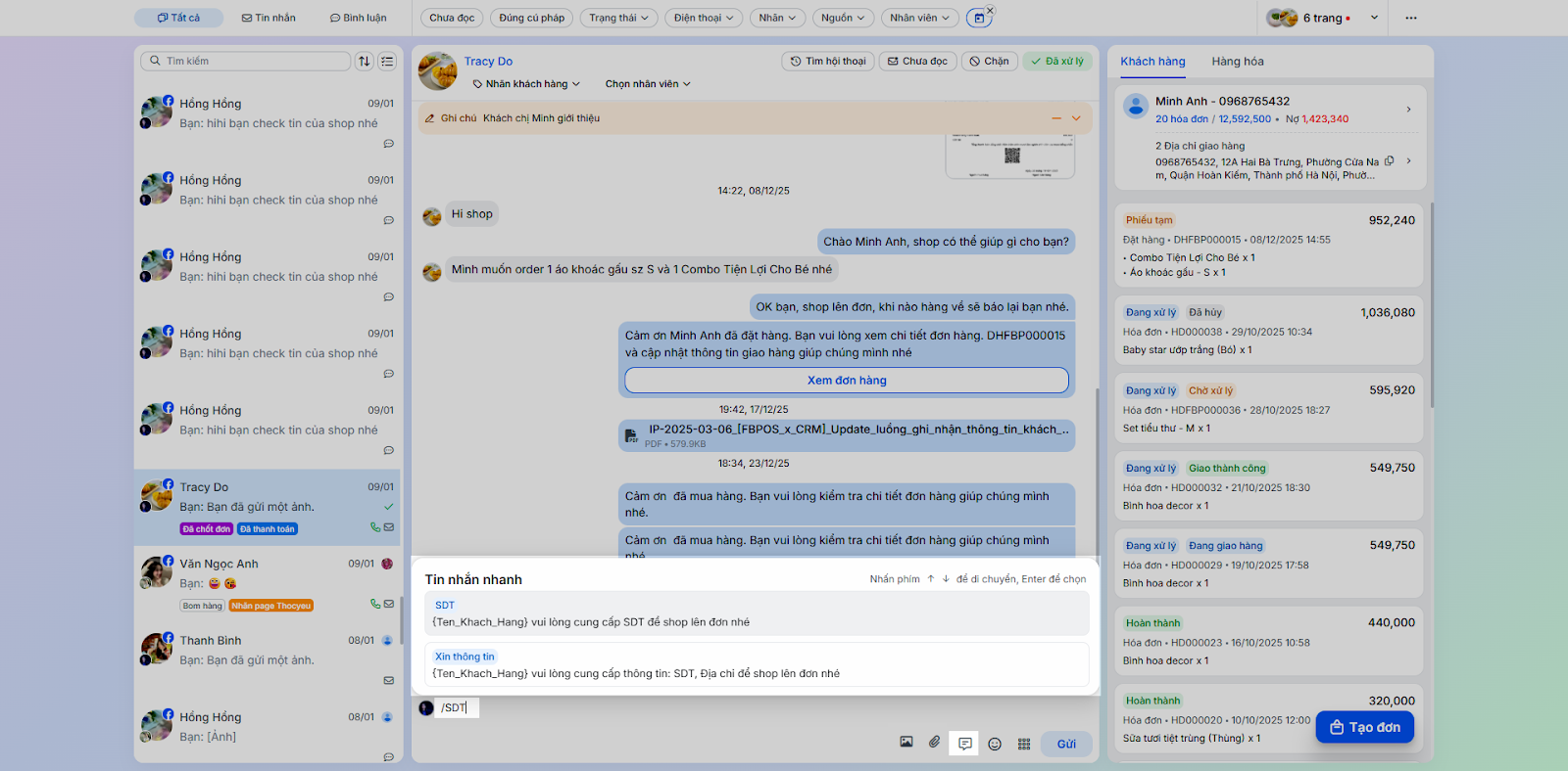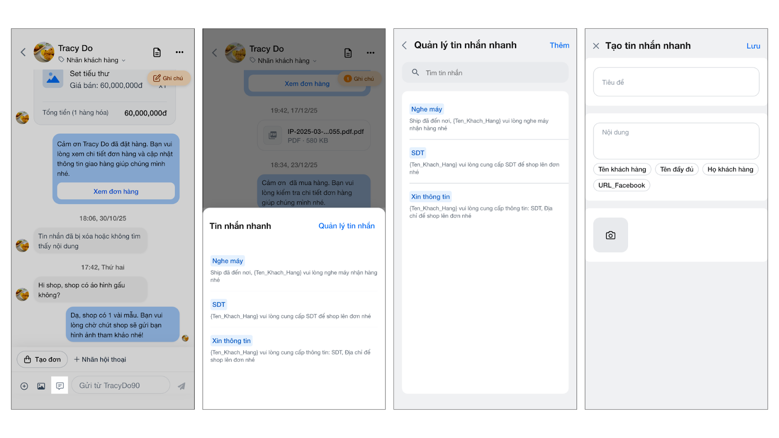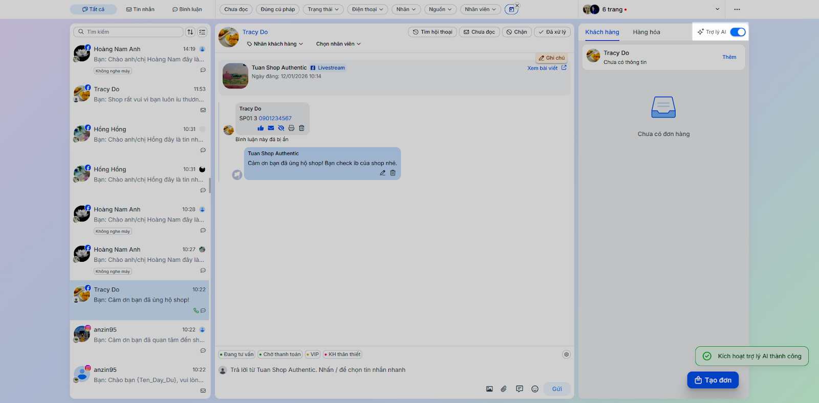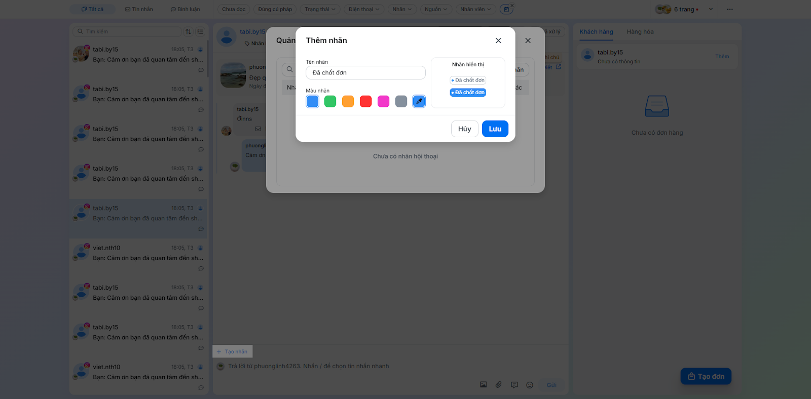 - Gán nhãn hội thoại: Giúp phân loại hội thoại dễ dàng (ví dụ: Chờ xác nhận, Đã chốt đơn).